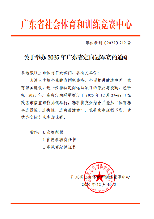 作为茂名备战2026年省运会、持续擦亮“定向之城”城市名片的重要一环,本次冠军赛旨在以赛聚人、以赛促产、以赛兴城。目前,赛事报名通道已正式开启,报名截止时间为12月20日。赛事详细规程可通过官方报名渠道(“活力圈”微信公众号)查询获取。
