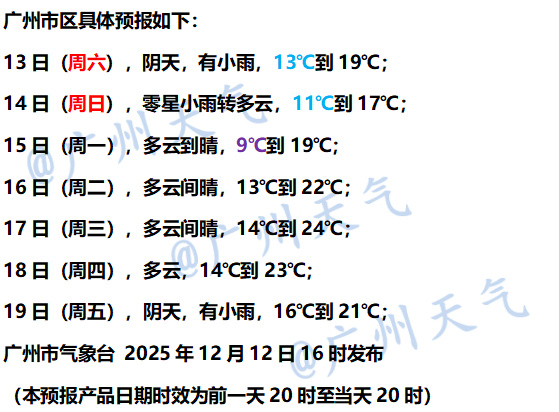 12月13日,广东省大部市县阴天有小到中雨局部大雨;气温缓慢持续下降,体感阴冷,白天最低气温将出现在傍晚前后:肇庆北部和粤北偏北市县9~12℃,南部沿海市县16~19℃,其余市县13~15℃。