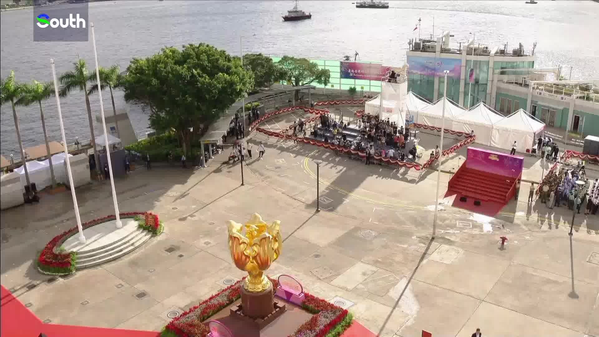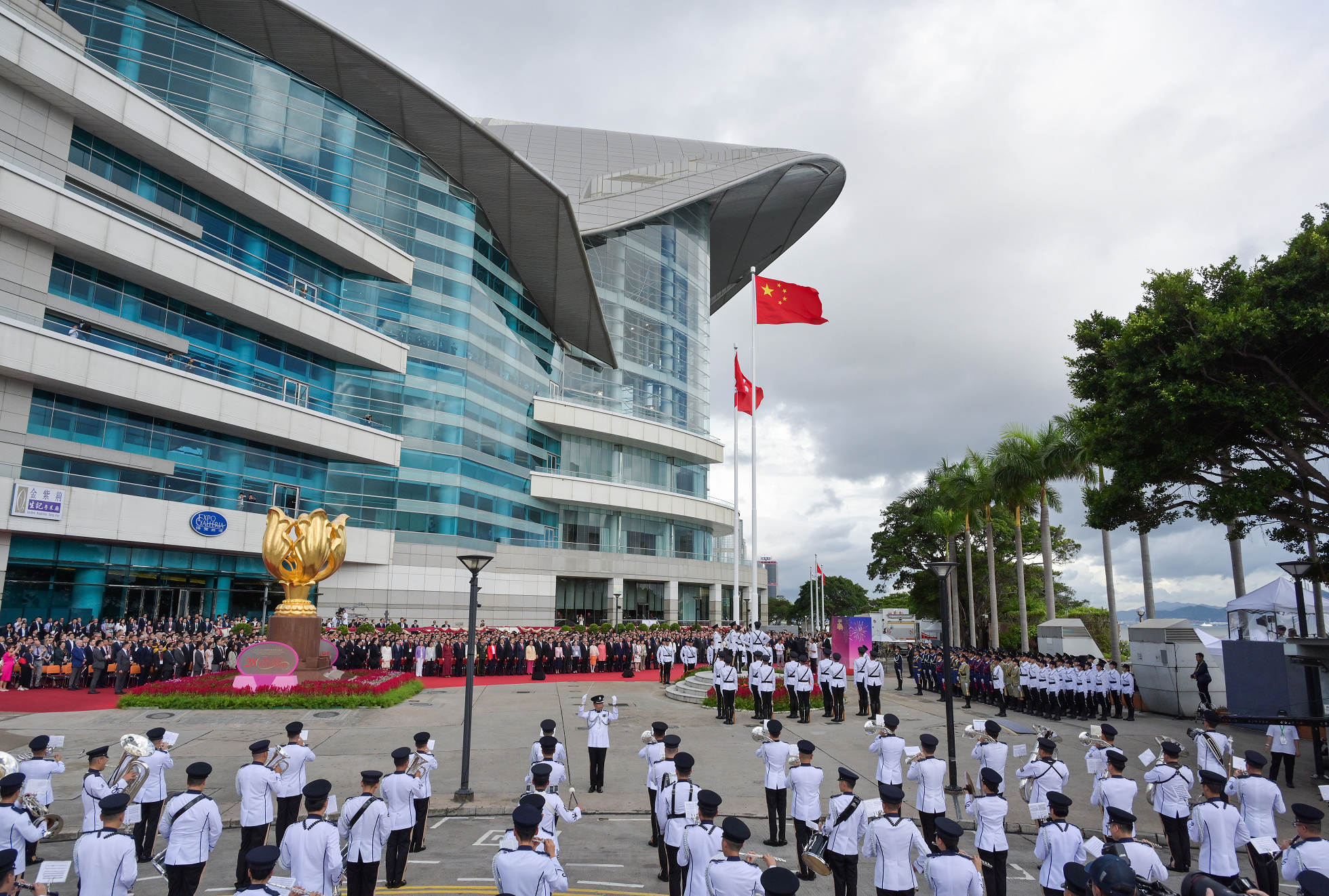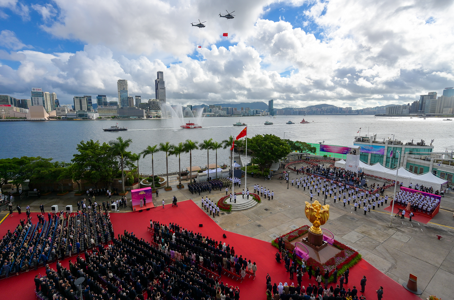 香港举行庆回归升旗仪式,国旗、区旗从维港飞过