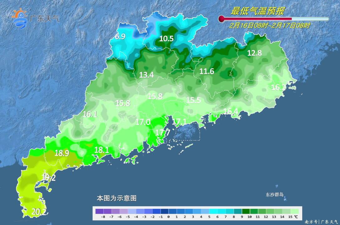18日(初二),粤西市县多云间阴天,其余市县晴到多云,早晚寒凉。早晨最低气温:粤北市县7~10℃(高海拔山区3~6℃),珠江三角洲北部和粤东市县10~14℃,雷州半岛市县17~20℃,其余市县14~17℃;18日白天开始气温回升。