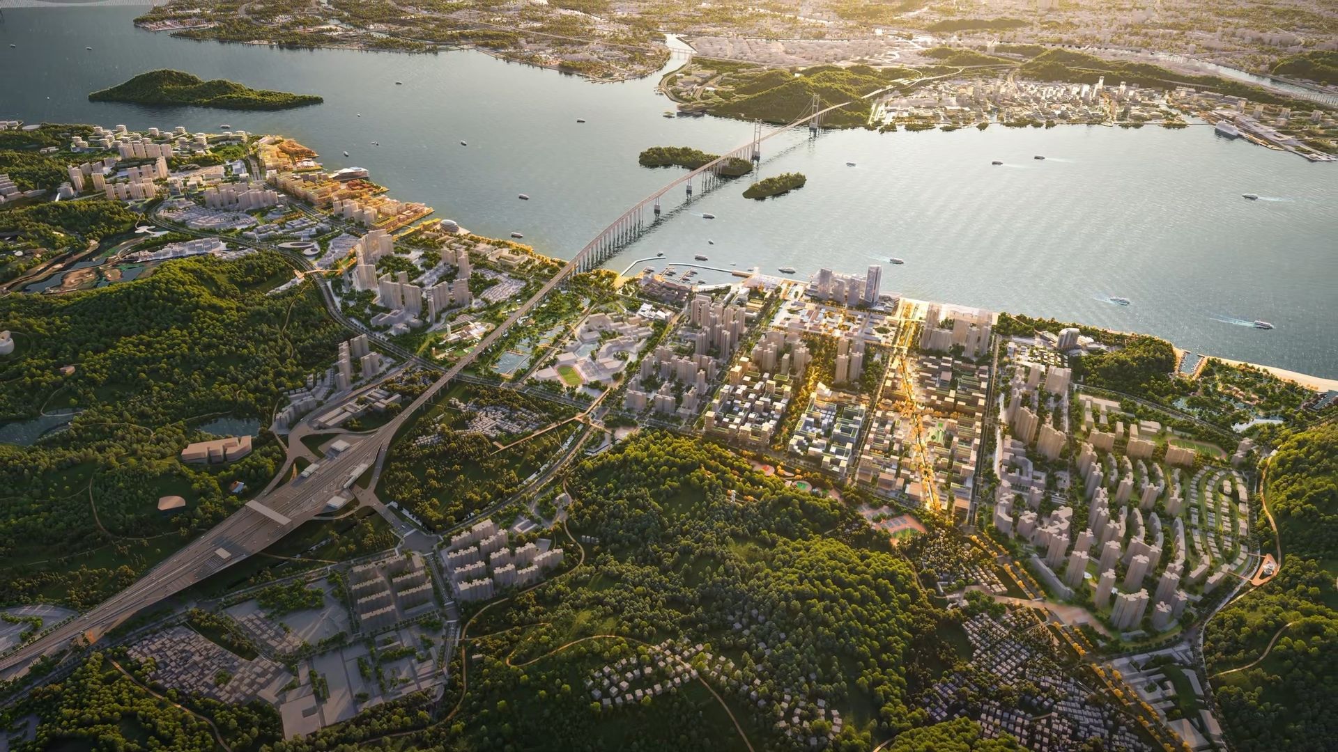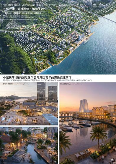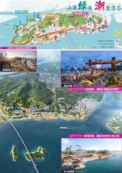 方案从“山海相逢、岭南水乡”中汲取灵感,提出“山海绿港、潮聚湾芯”的概念,并通过以下五大策略塑造特色的空间体系:首先,通过生态筑基构建山海城一体的韧性网络。第二,强调产业共兴:构建“文旅体智”超链走廊。第三,强化城景交融:塑造世界级山海风景。第四,全域链接:在交通层面,推动海陆空地下多维联通。第五,共创共享:以超级湾民社群引领新风尚。