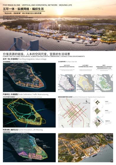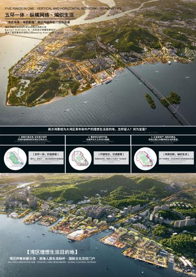 设计方案介绍:方案以“五环一体、纵横网络、编织生活”为主题,旨在吸引并留驻大湾区青年与新中产,将南沙湾建设为国际滨海生活理想目的地。宏观上,构建环蕉门岛“五环一体”功能结构:以慢行贯通的滨海环、连续地标的活力环、串联山体户外环与山脚康体环、融合开放的社区环,紧密衔接山海资源与日常生活,构筑支撑长久发展的骨架。中观层面,优化交通、纠偏空间尺度:释放港前大道为人本街道,建立“双环”交通体系,以连续步行网络与小尺度的“超级街区”推动“车本位”到“人本位”空间转型,营造有温度、可停留的公共环境。微观层面,聚焦社群场景创新:依托粤港澳文化同源优势,打造促进三地交流的标志性产品与场景,营造北港、中城、南创、新镇四类社群聚落,匹配目标社群的公共生活需求。