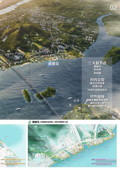 设计方案介绍:方案以现状十条河涌为脉络,通过上游减法和下游加法,构建从山到海的生态基盘,并形成河集、海集、岛集三类水生活场景,重建人、城、水的关系。