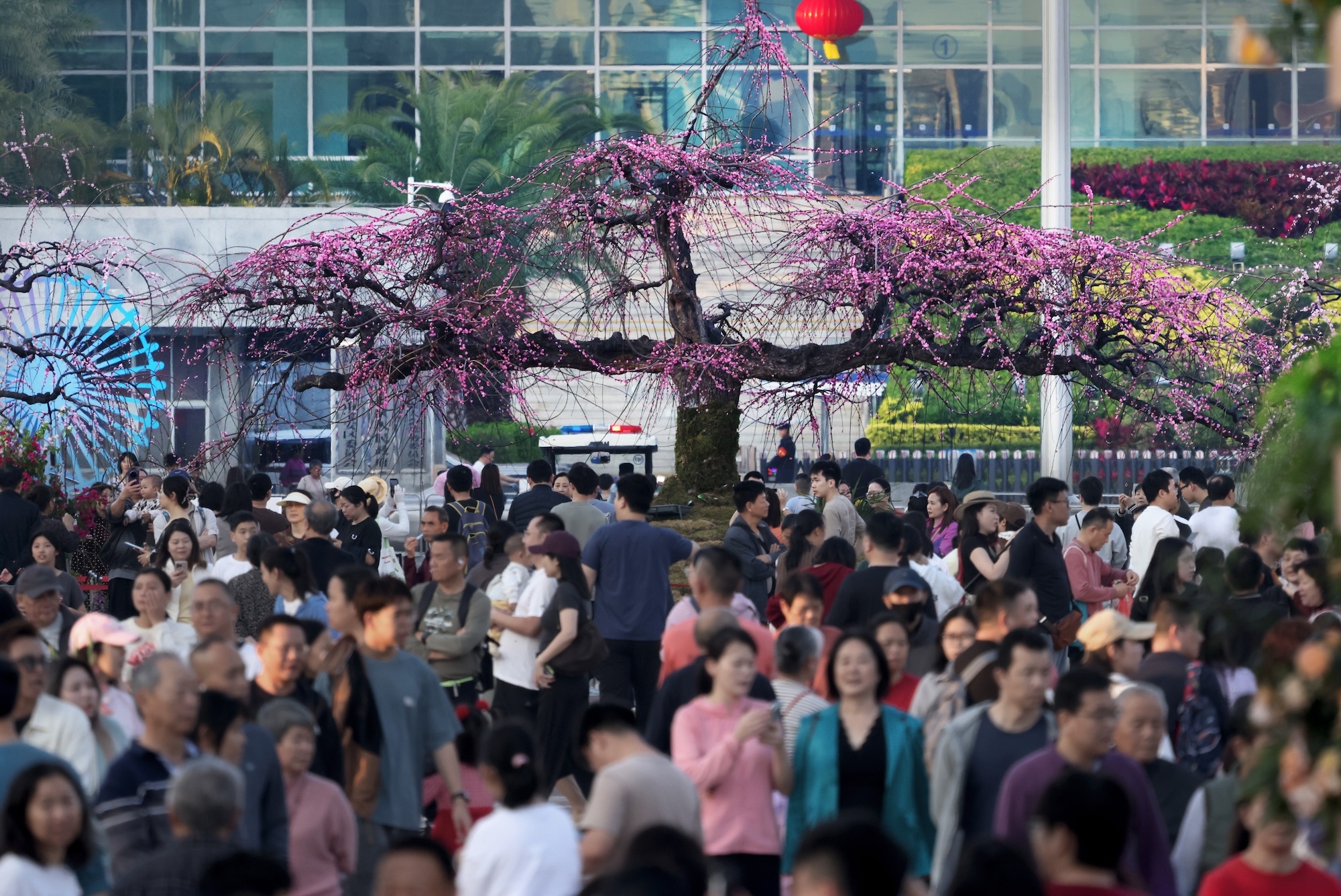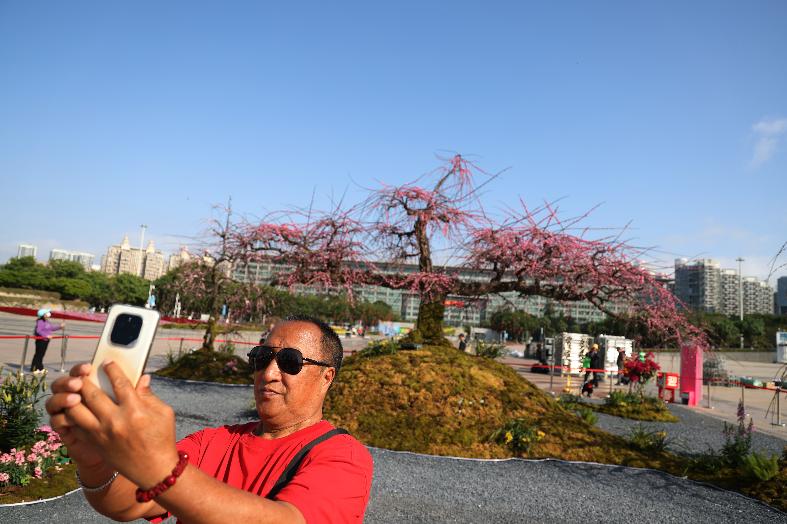 2月16日,阳光明媚,深圳市宝安海滨广场新春花展热度不减。尽管迎春花市要于当日落幕,但作为花展“镇展之宝”的276岁垂枝龙梅依然吸引大批市民游客纷至沓来——这株来自杭州的古梅,成为了2026年深圳花市的“绝对网红树”。