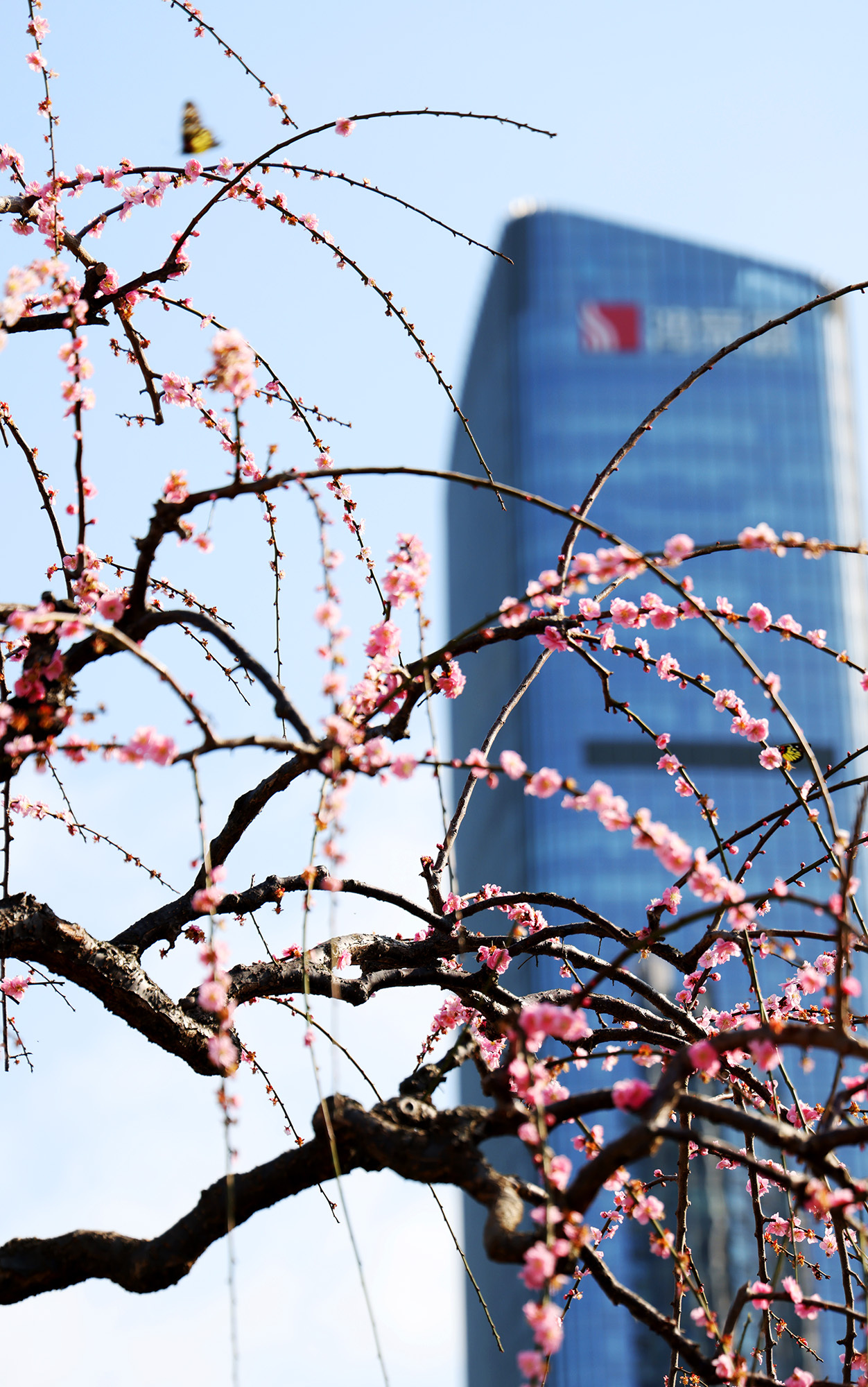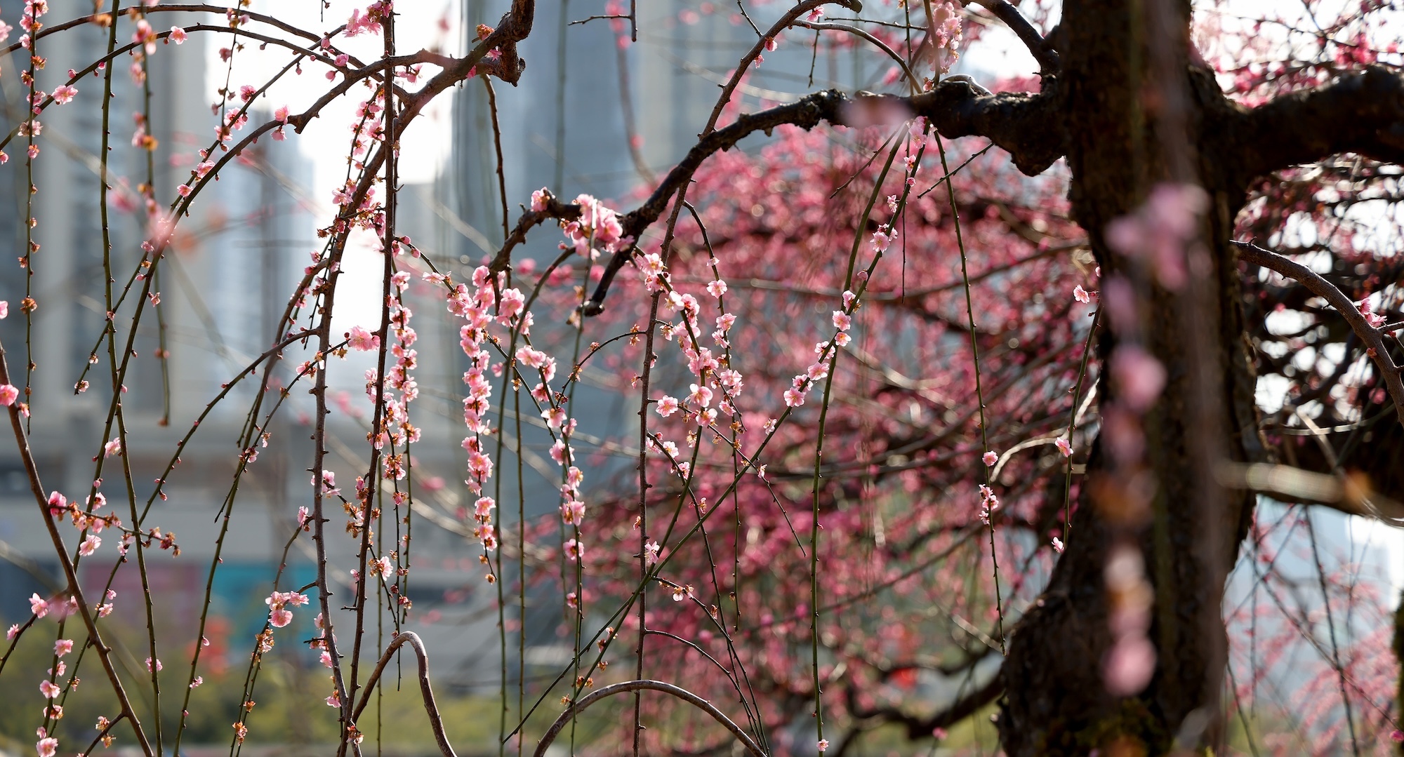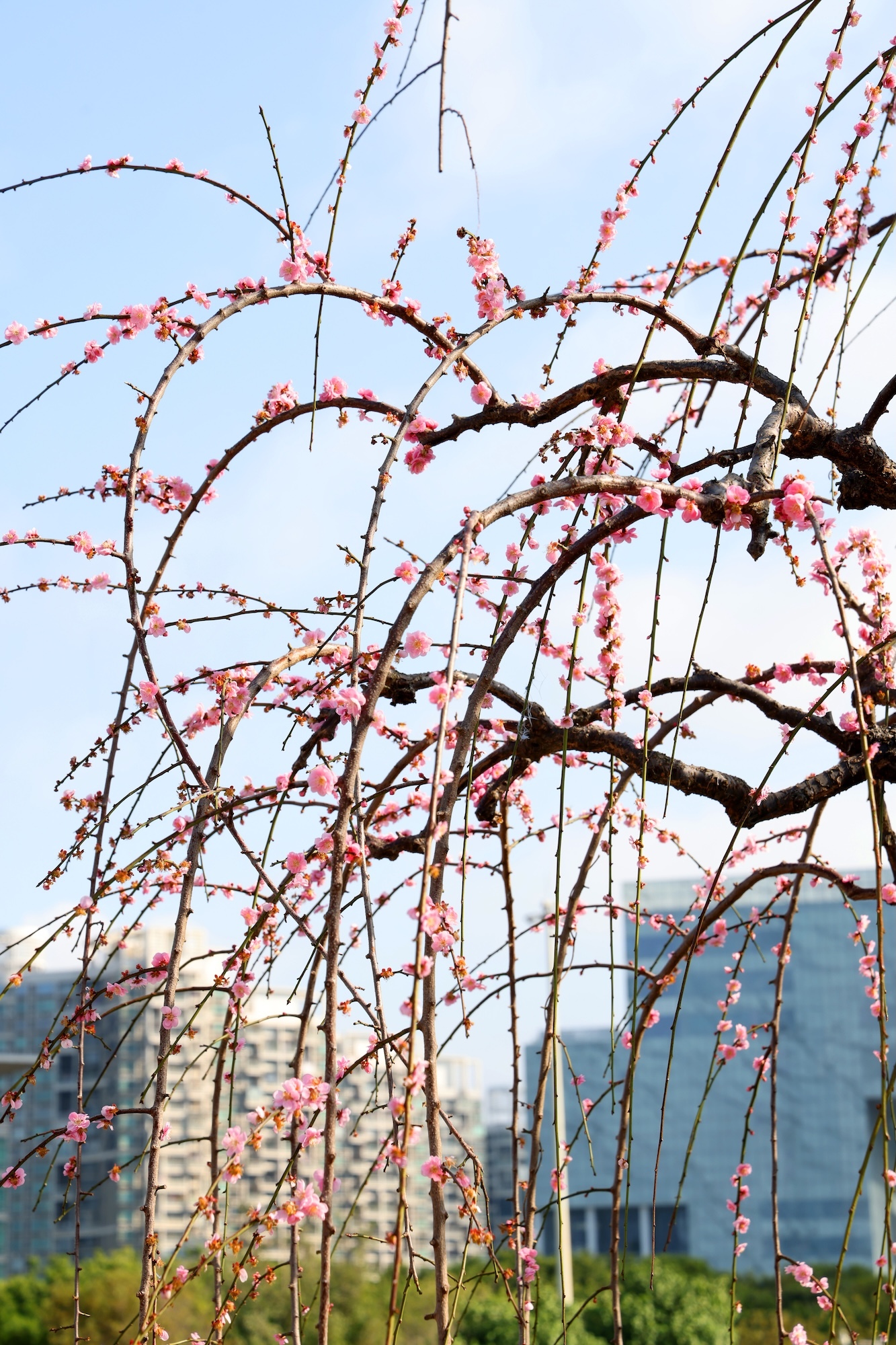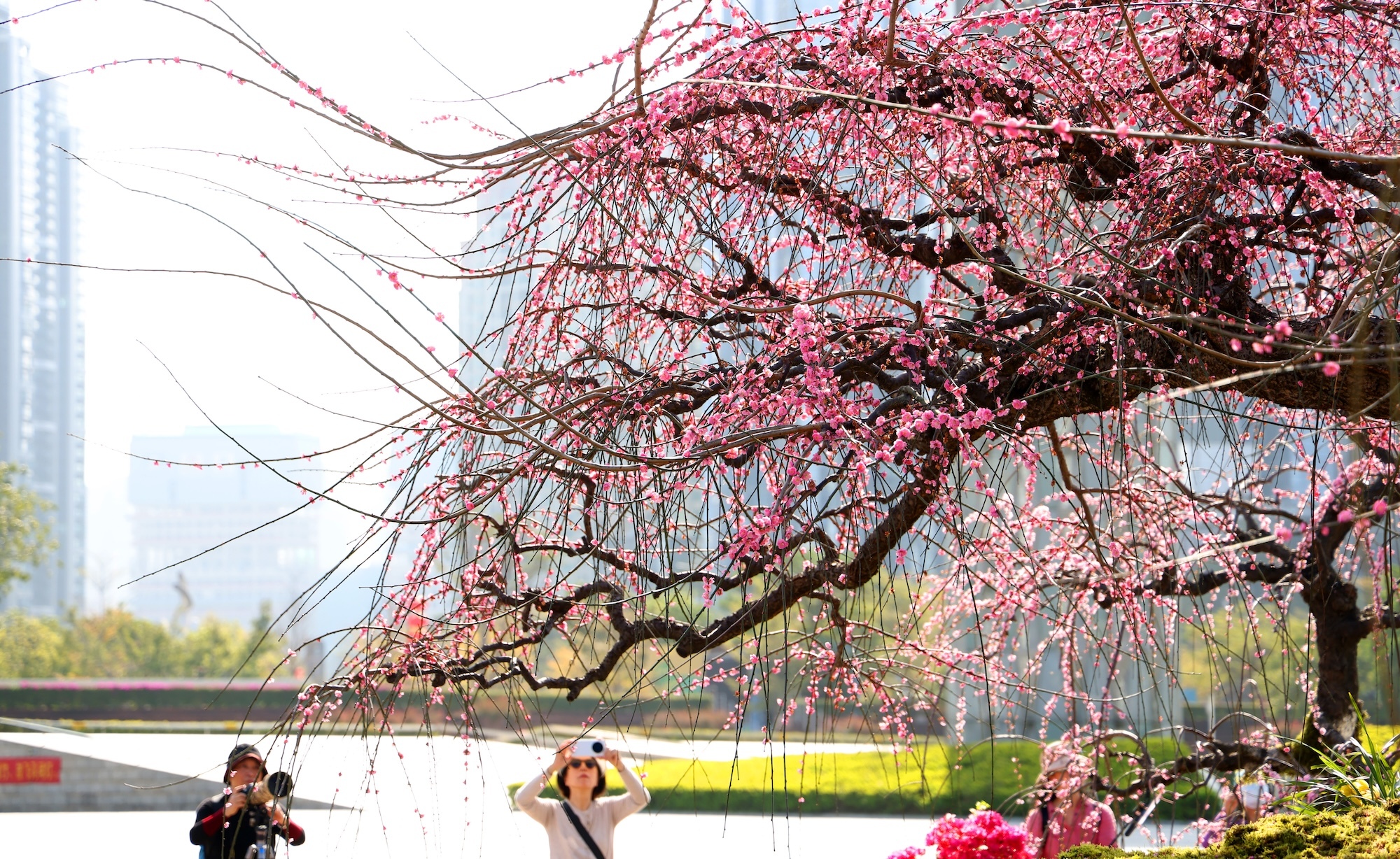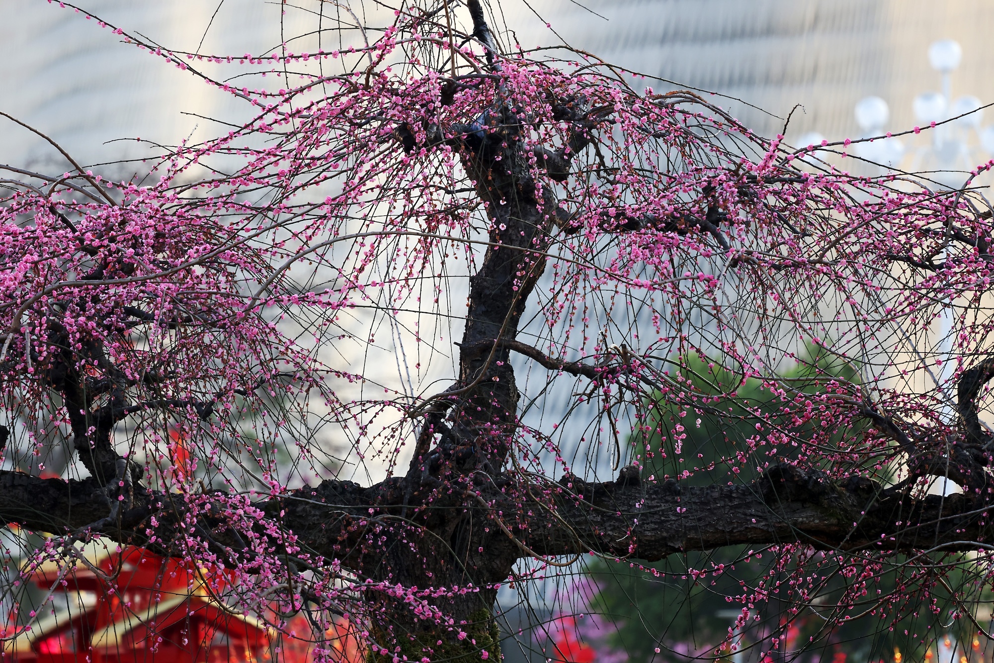 粉白花朵缀满近十米长的柔韧垂枝,在晴空下如瀑如云,树下人头攒动,快门声此起彼伏。若你走到近前,仔细观察:一簇梅枝自然交叠,花开成簇,恰好形成一颗饱满的心形,“像两颗心依偎在一起,太有缘分了!”