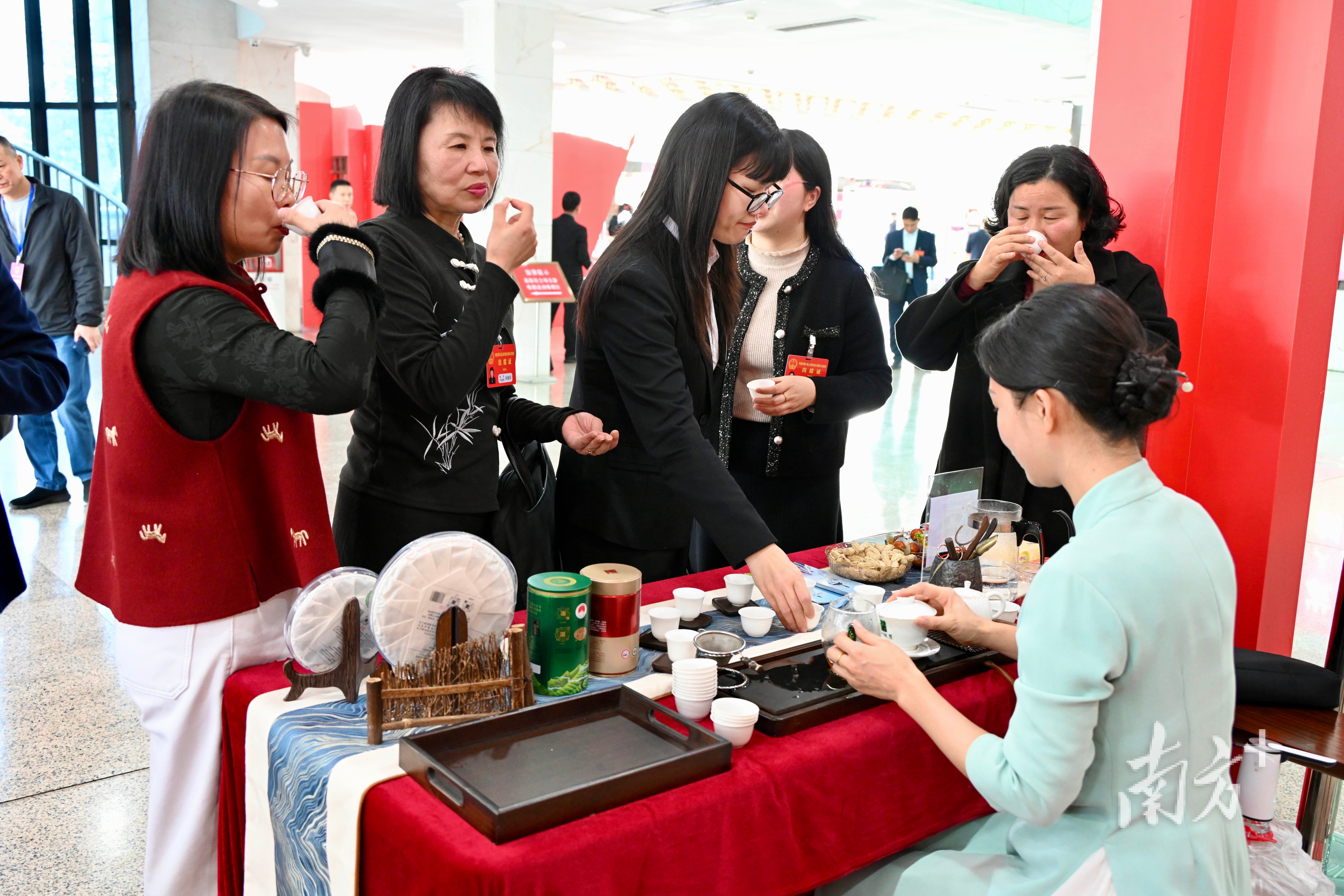 在农特产品展区,东源仙湖茶、紫金蝉茶、东源板栗备受青睐,多名人大代表端起白瓷茶盏细品茶香。河源山地资源丰富、气候适宜、环境优越,土壤植被状况好、昼夜温差大,是种好茶、产好茶的优良地区。“东江三大名茶”——上莞仙湖茶、康禾茶、紫金黄花茶均是有着数百年发展历史的名优茶。东源县种植板栗历史悠久,是广东省最大的板栗生产场地,被誉为“板栗之乡”。东源板栗成熟期在9月中旬,一级果平均每千克70粒左右,果大质优,色泽油亮,其果实甜而不腻,既可代粮也可作膳,生熟食皆宜。目前,河源板栗种植面积12.34万亩,鲜果年产量1.6万吨,居全省地市首位。