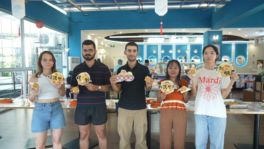 活动现场的“月满中秋”专区,成了传递温情的“治愈角”。荔园第一食堂的师傅们带来面粉、莲蓉、蛋黄等食材,手把手教新生做月饼。何女士举着自己做的月饼,脸上满是笑意:“真没想到大学城会办这种活动!中秋是咱们的传统节日,能自己动手做月饼,感觉特别有意义。而且超幸运的是,在这里还认识了几个国际留学生朋友,一起聊关于中国的一些传统文化,今天这趟真是来值了!”