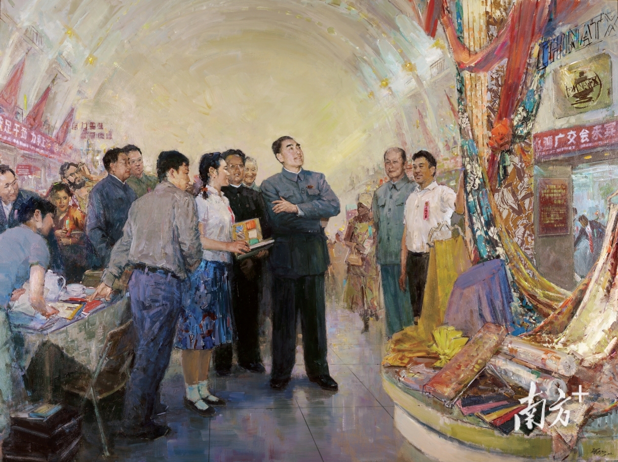 展览中,由广东画家李金明创作的油画《周总理与广交会》,描绘了周恩来总理在广交会现场,视察各个展馆,仔细查看展出商品的场景,画面中鲜活的历史气息扑面而来。
