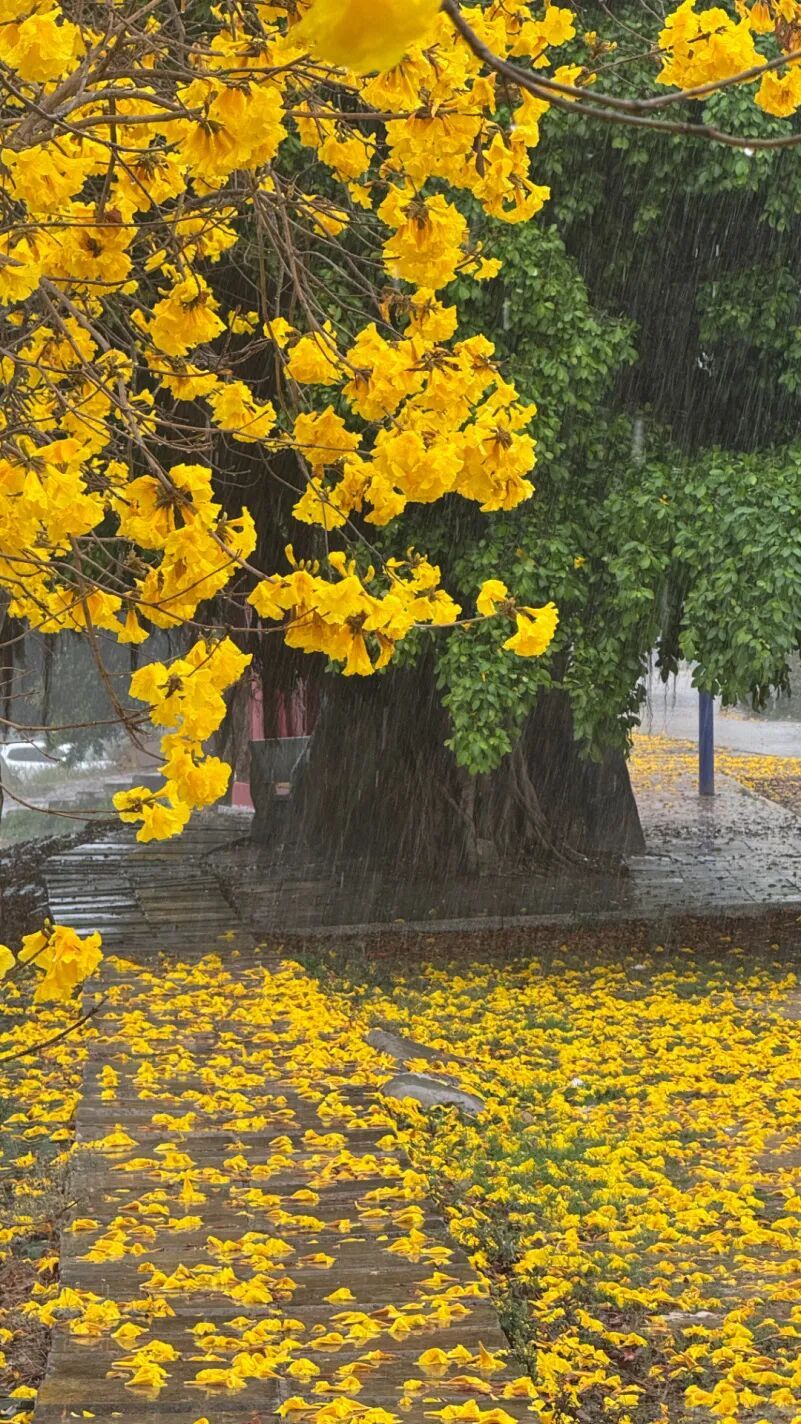 黄花风铃木在雨幕中灿然挺立