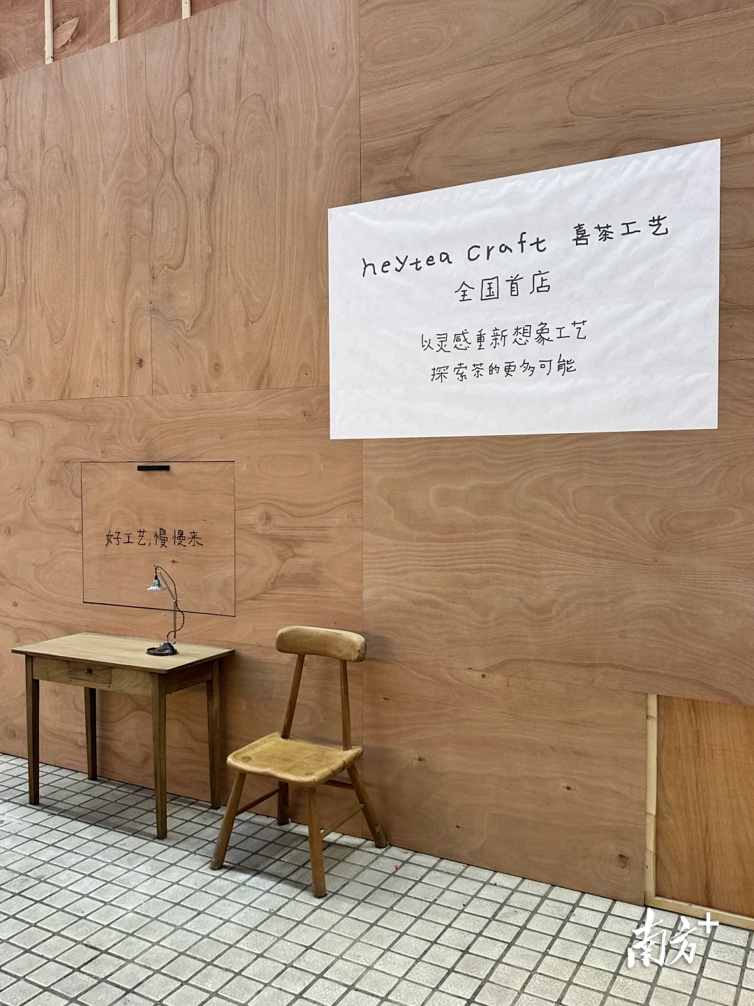 从社交平台曝光的图片来看,门店摒弃了喜茶传统明亮风格,整体采用原木拼接的质朴风格,颇有手作质感,还摆放了复古课桌椅、台灯等,还原“工匠工作台”实景。此外,装修围挡清楚标注“喜茶工艺,全国首店”“以灵感重新想象工艺,探索茶的更多可能”“好工艺,慢慢来”等标识,传递出对于工艺的侧重。