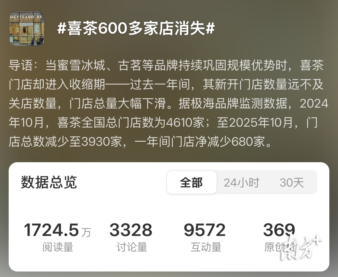 这一战略调整直接反映在门店规模上。据极海品牌监测数据,2024年10月,喜茶全国总门店数为4610家;至2025年10月,门店总数减少至3930家,一年间门店净减少680家。2025年12月,“喜茶600多家店消失”等相关话题在社交平台引发关注。