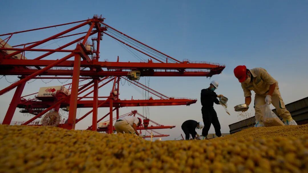 ▲2025年11月26日,在国投洋浦港5号泊位,报关员对一批来自国外的大豆进行抽检。这批大豆将在自贸港内的企业加工,并享受加工增值内销免关税政策