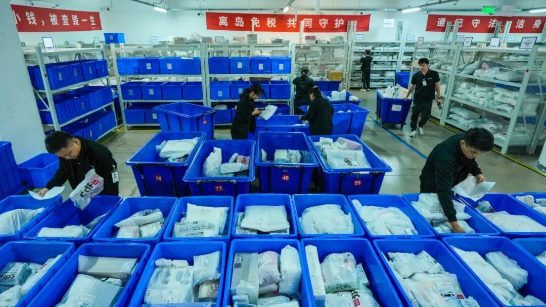 ▲2025年11月1日,海南离岛免税购物新政正式实施,在cdf海口国际免税城的分拣仓库内,分拣员正加紧对暴增的免税商品进行初扫作业。据海口海关统计,2025年11月1日至30日海南离岛免税升级政策实施首月,离岛免税购物金额达23.8亿元,同比增长27.1%