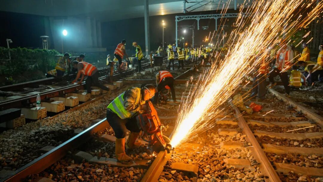 ▲2024年11月12日,在位于海口市粤海大道1号的海口站,工人在深夜里开展铁轨切割、拨移与连通等作业。这是海口南港“二线口岸” (普铁旅客)查验设施建设的关键环节,该口岸是海南岛内外联通的重要枢纽