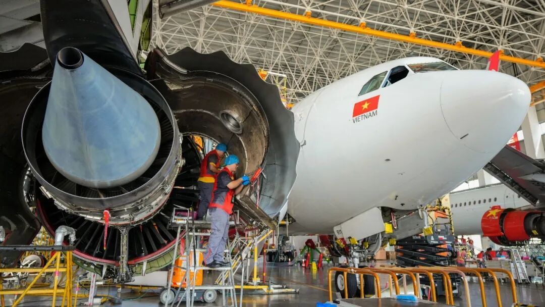 ▲2025年9月23日,在美兰机场的海南自贸港一站式飞机维修产业基地,机务维修人员对飞机进行检修。自2022年投产以来,截至2025年8月底,该基地已完成超2300架次飞机维修、超270架次整机喷涂及5.8万件航空零部件维修