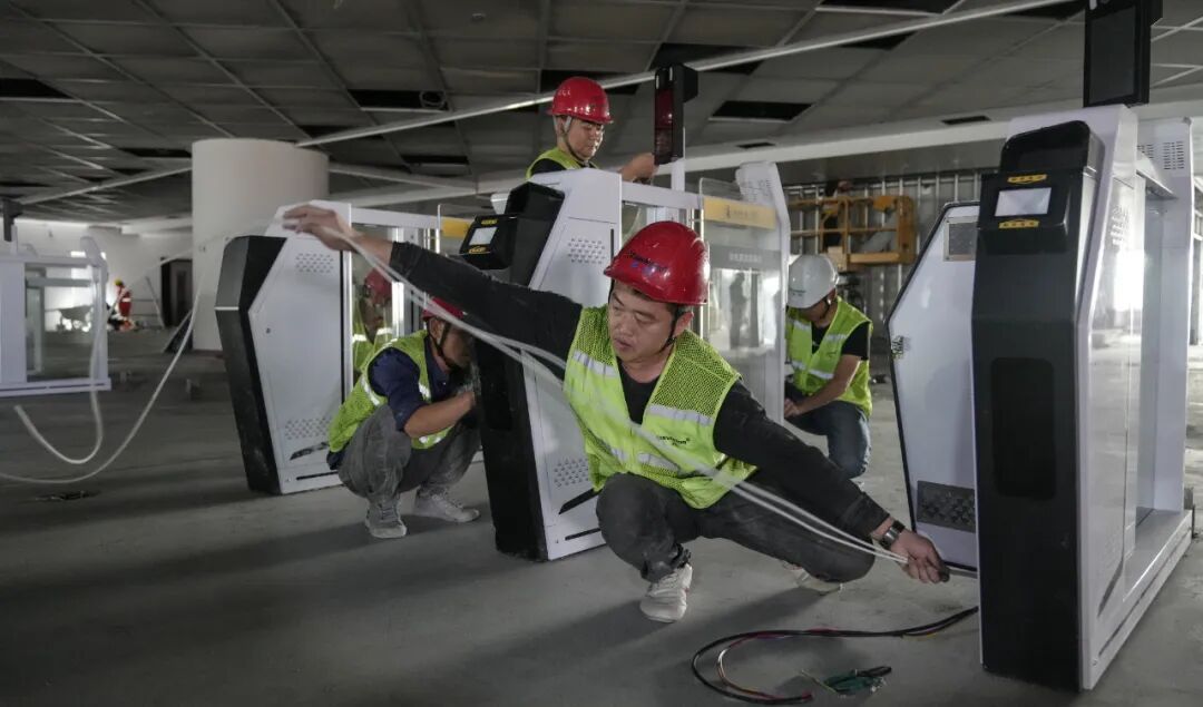 ▲2023年3月10日,在海口新海滚装码头客运综合枢纽站,工人正在安装海口新海港和南港 “ 二线口岸 ”旅客出岛查验区的智能闸机设备
