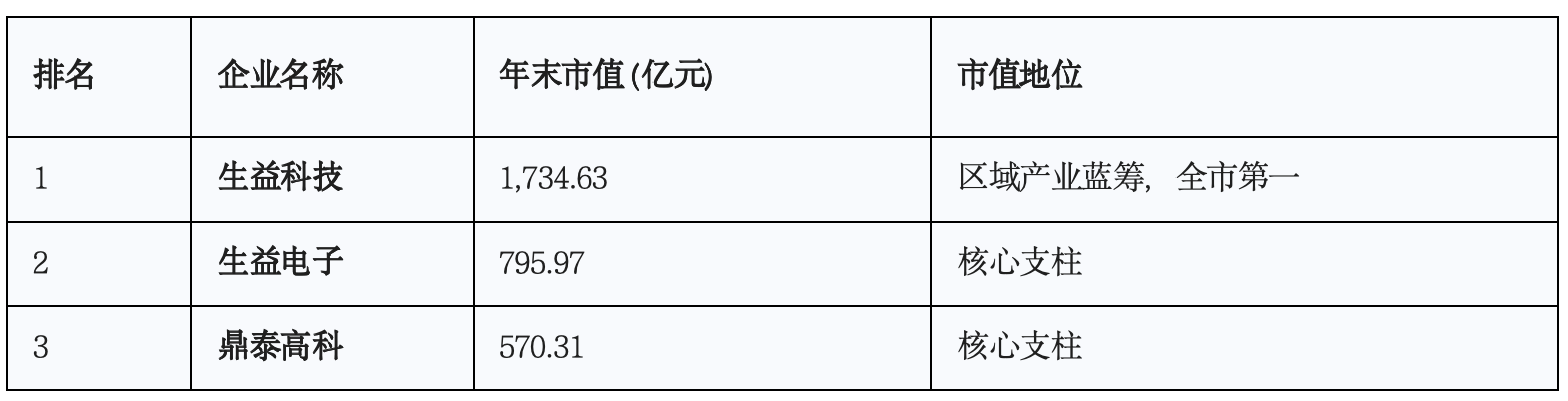此外,资本市场“东莞板块”市值结构呈现出鲜明的梯队特征。其中,市值超500亿元的龙头企业有3家,构成区域资本的核心支柱:生益科技以1734.63亿元市值位居第一,生益电子、鼎泰高科分别以795.97亿元和570.31亿元紧随其后。仅这三家企业市值合计就占全市总市值约38.8%,显示出显著的集聚效应。