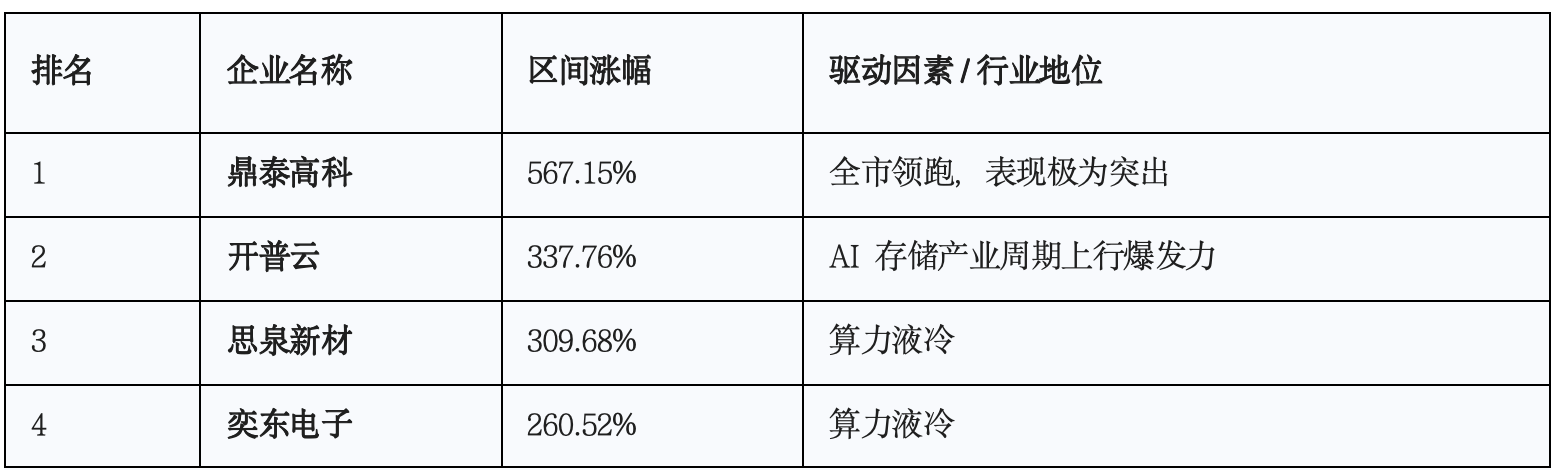 在个股方面,多家企业表现亮眼。比如,鼎泰高科以567.15%的涨幅位居榜首;开普云紧随其后,上涨337.76%,显现出布局算力存储赛道后的成长潜力;思泉新材、奕东电子、安达智能等公司也凭借细分领域的技术优势,分别实现309.68%、260.52%和245.66%的显著涨幅。