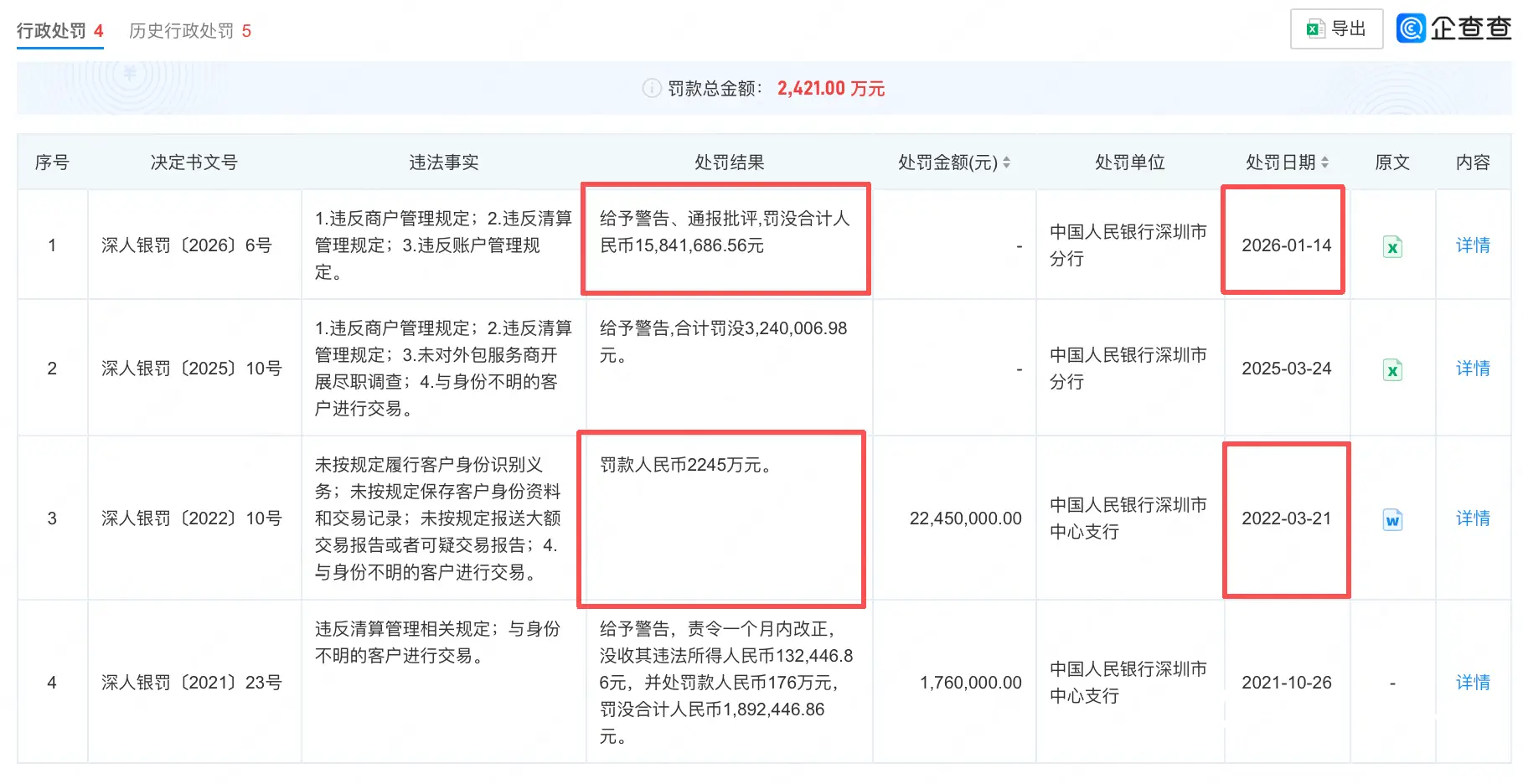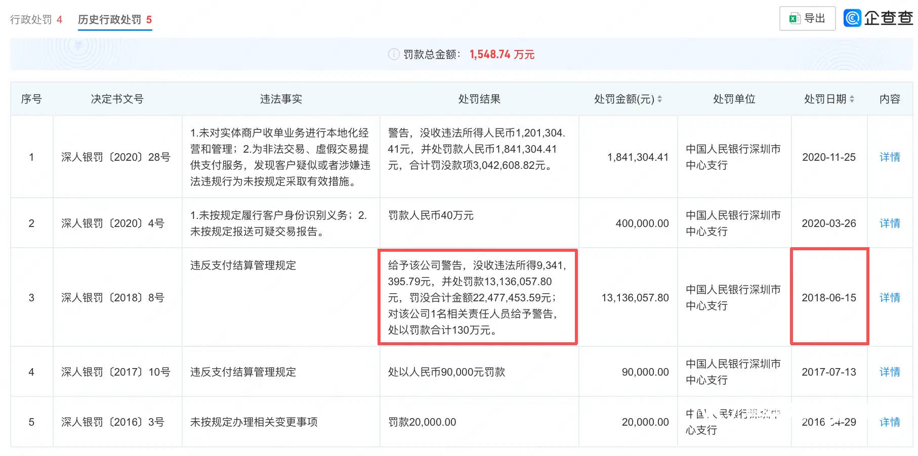 2018年6月15日,该公司因违反支付结算管理规定,被给予警告,没收违法所得约934万元,并处罚款约1313万元,罚没合计约2247万元;2022年3月,该公司因未按规定履行客户身份识别义务、未保存客户身份资料和交易记录、未按规定报送大额或可疑交易报告以及与身份不明客户进行交易等原因,再次被处以2245万元罚款,时任董事长陈某被罚款44.9万元。