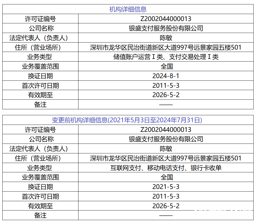 银盛支付官网信息显示,该公司成立于2009年,是2011年获得首批《支付业务许可证》的支付机构之一。中国人民银行的信息公示中显示,该公司在2024年8月完成最新一次支付牌照续展,业务许可范围为全国范围内的储值账户运营Ⅰ类、支付交易处理Ⅰ类,即原来的互联网支付、银行卡收单等,许可证有效期至2026年5月2日。