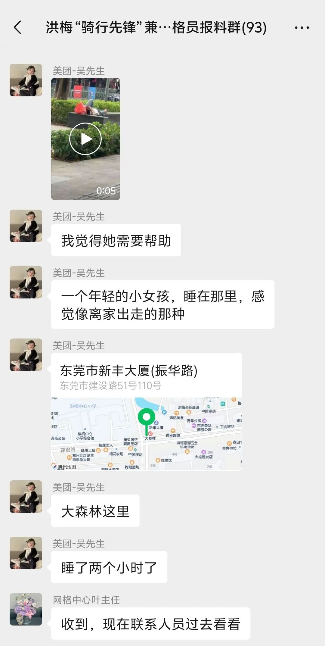 “其实也怕耽误送餐,但就是觉得不踏实。”小吴后来回忆。他下车轻声问了两句,女孩没有回应,出于担心,小吴毫不犹豫地掏出手机拍了张照,配上位置和简单说明,发到了洪梅镇“骑行先锋”兼职网格员报料群。信息刚发出,便引起了重视。