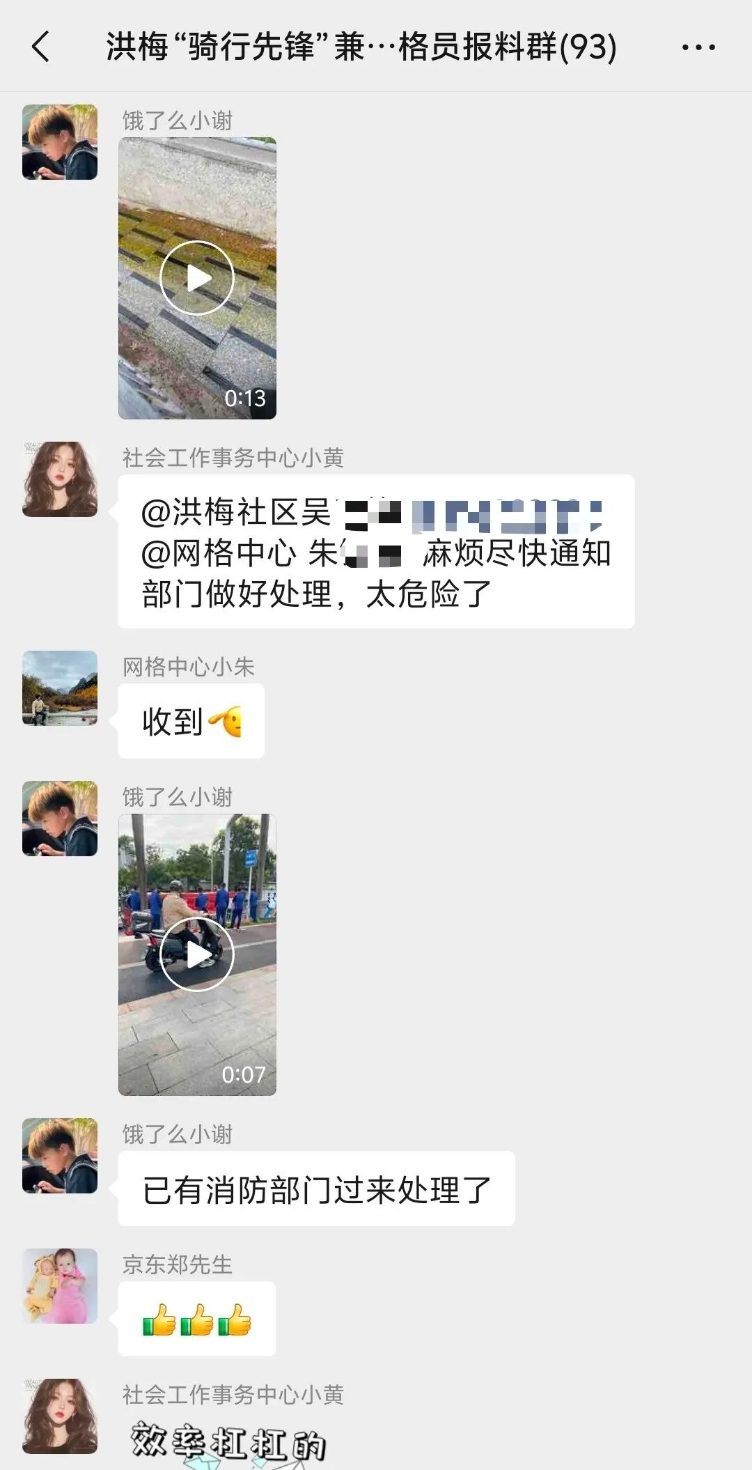 消息刚发出,群里快速响应。网格员正准备过去核实派单,小谢紧接着又发了一条:“已有消防部门过来处理了!”原来,群里有消防队员在线,他们看到消息便直接出动。