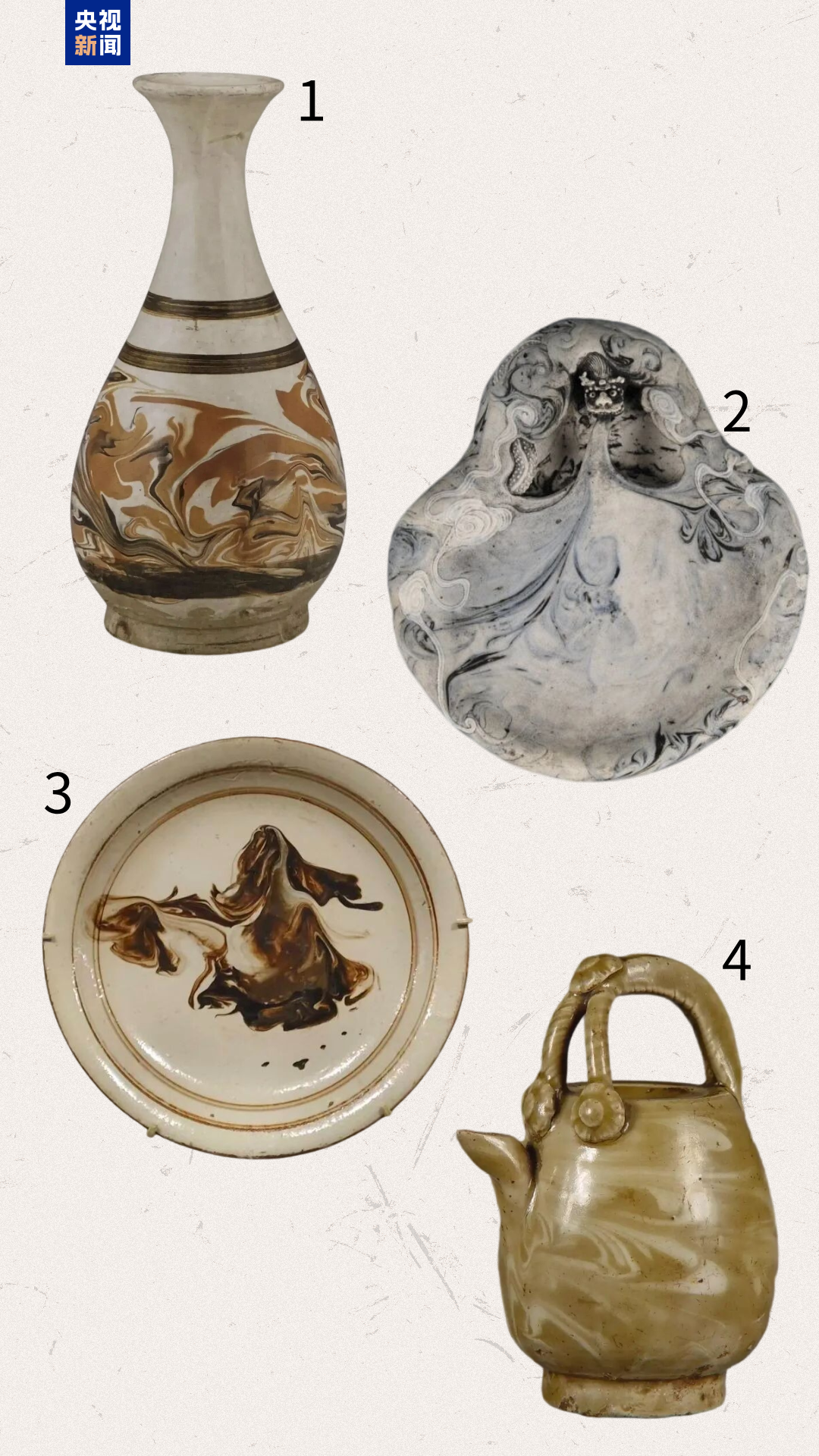 △1:宋 绞釉玉壶春瓶 长治市博物馆藏 2:清 绞釉云龙纹瓷砚 常熟博物馆藏 3:清 白地绞釉盘 铜川博物馆藏 4:辽 绞釉三叉带子提壶 大同市博物馆藏