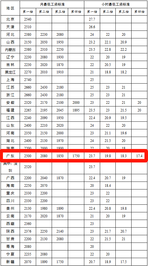 广东省月最低工资标准方面