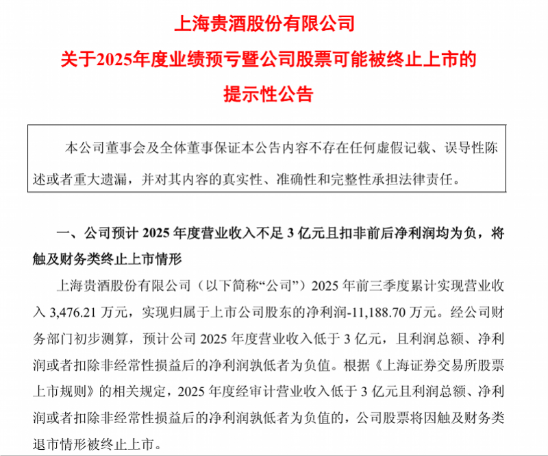 公告显示,2025年前三季度,上海贵酒累计实现营业收入3476.21万元,实现归属于上市公司股东的净利润-11188.70万元。经财务部门初步测算,上海贵酒预计2025年度营业收入低于3亿元,且利润总额、净利润或者扣除非经常性损益后的净利润孰低者为负值。根据《上海证券交易所股票上市规则》 的相关规定,公司股票将因触及财务类退市情形被终止上市。