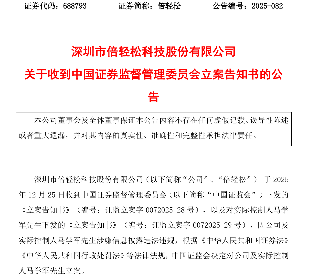 12月25日晚间,深圳市倍轻松科技股份有限公司(688793.SH,以下简称“倍轻松”)发布公告称,公司及实际控制人马学军因涉嫌信息披露违法违规,收到中国证监会下发的《立案告知书》。根据相关法律法规,中国证监会决定对公司及马学军立案。