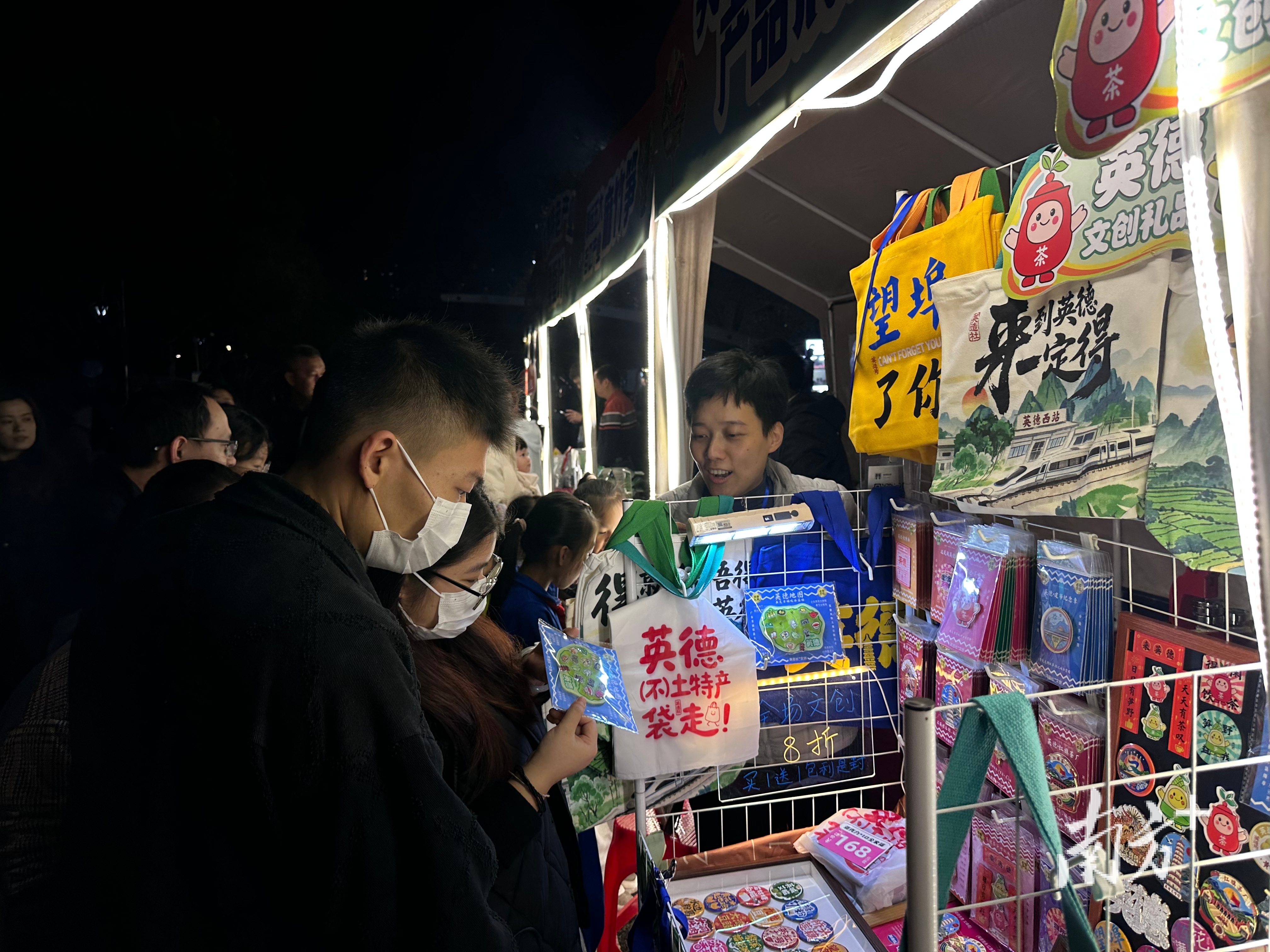 “这是我们结合英德特色元素如英德红茶、麻竹笋、英石而制作的文创产品。”在文明集市,英德文创产品展示摊位吸引了不少群众。摊主陈锦辉介绍,他们创作的充满英德元素的帆布袋、冰箱贴等产品特别受欢迎。“我们希望通过创作文创产品,让更多的年轻人了解和认识自己的家乡,把英德的特色文化传播出去。”