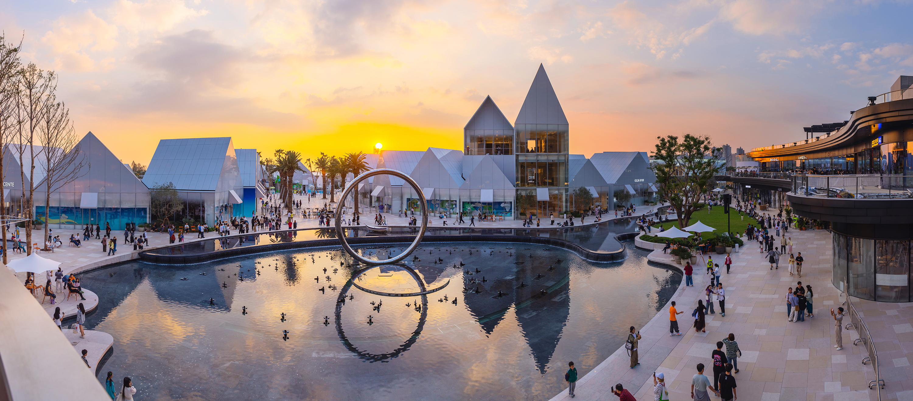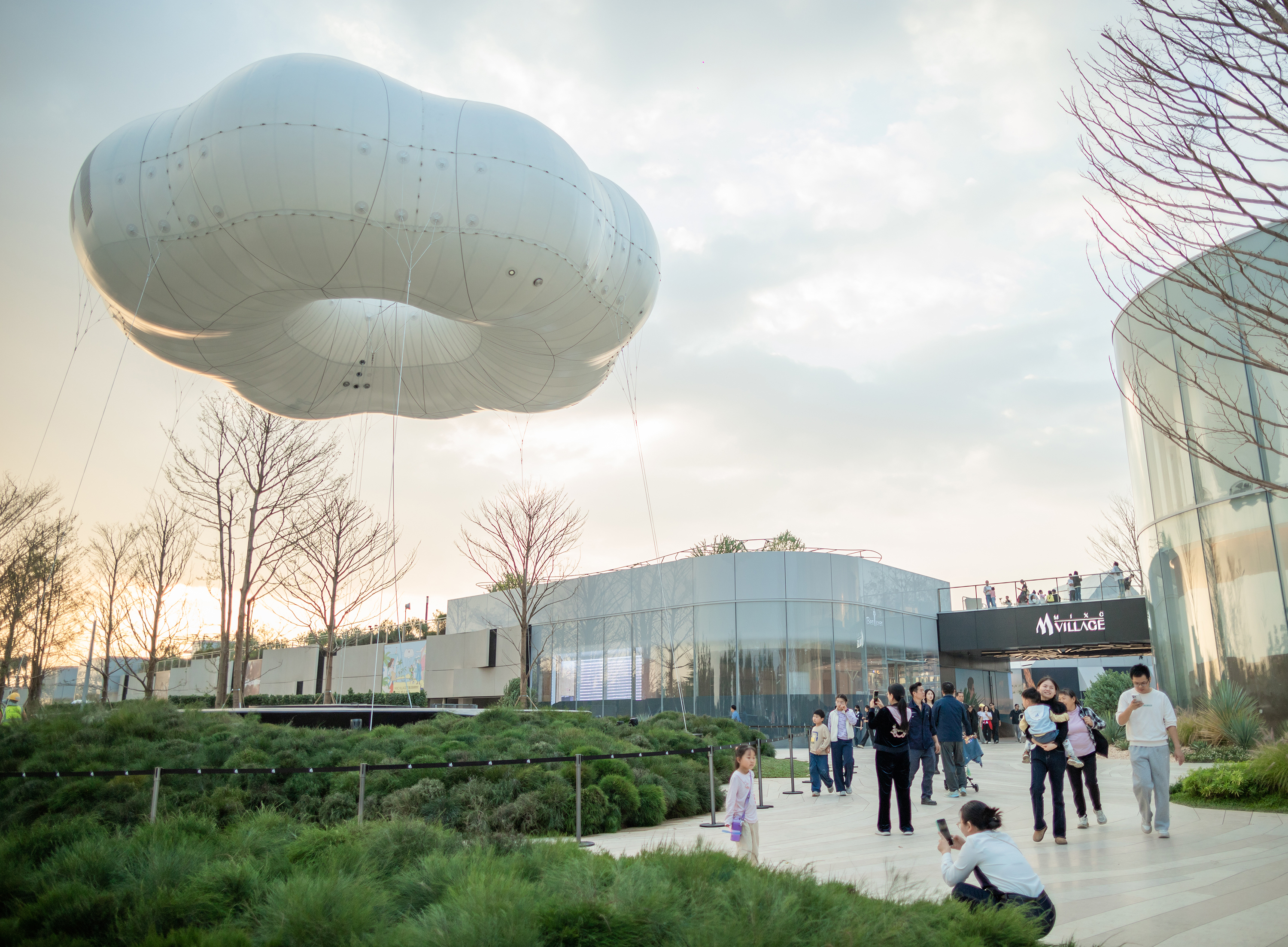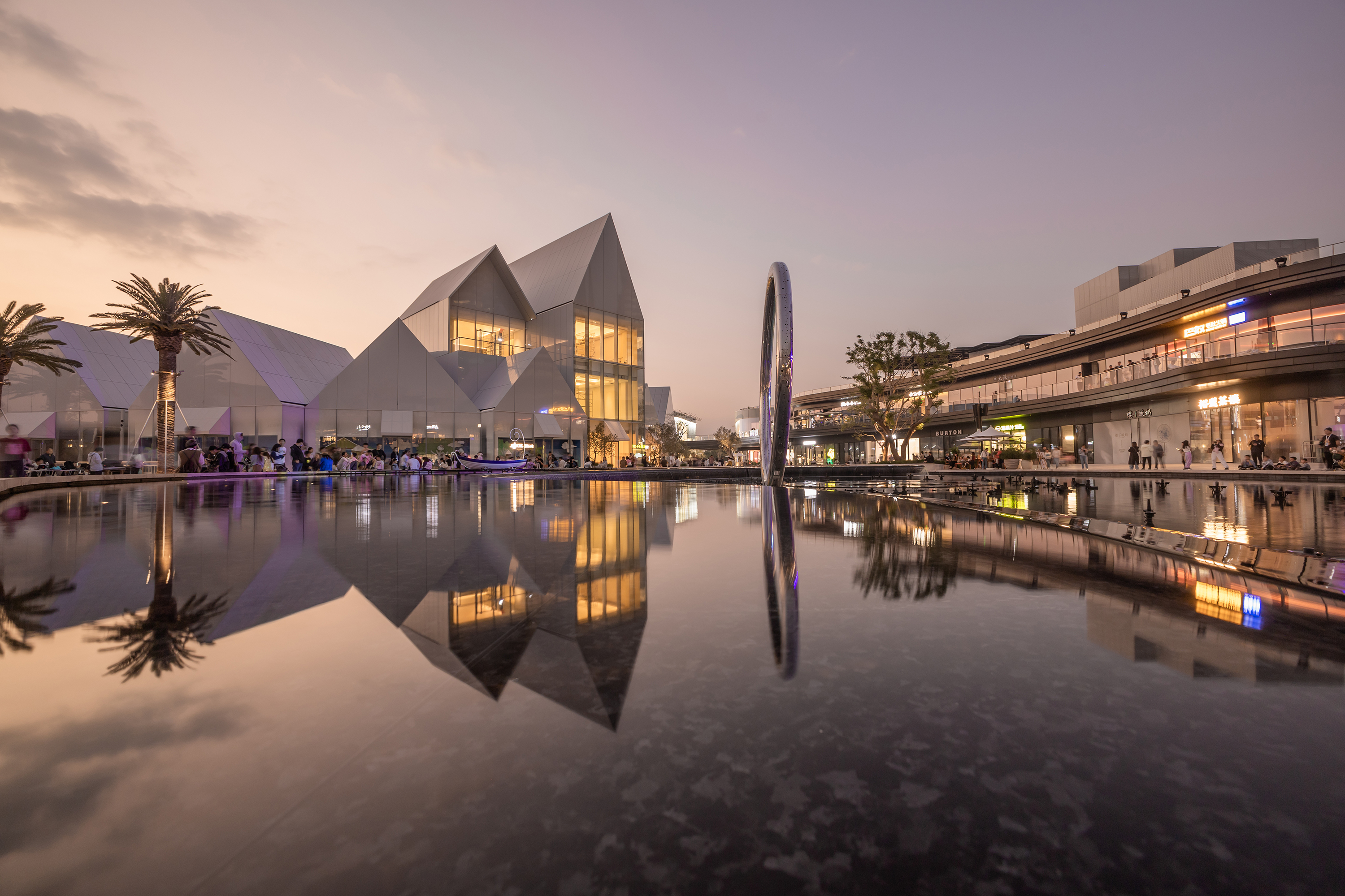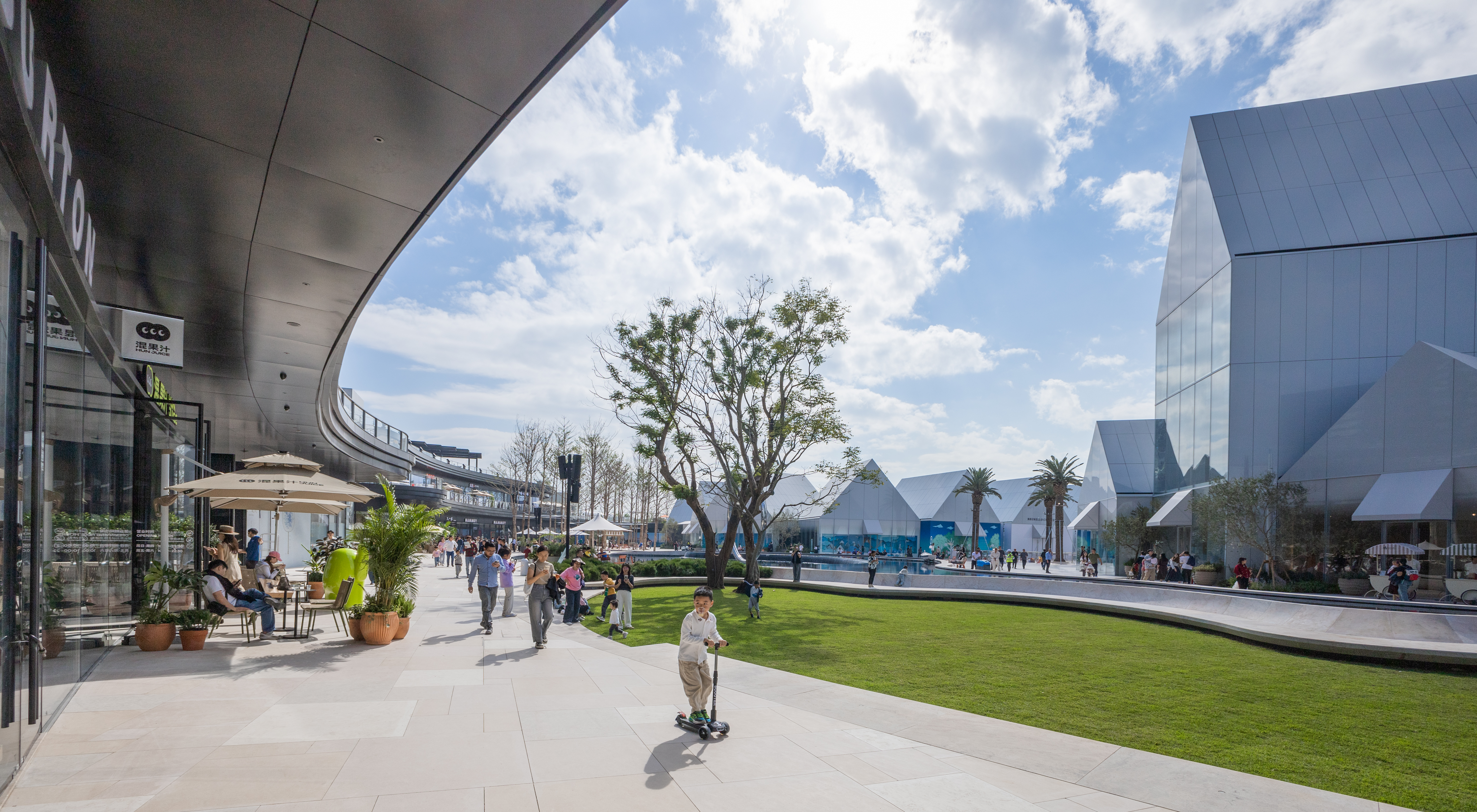 “墨”区域是中心湖和室内购物中心,以黑色为基底,凸显出白色独栋建筑的简约立面和精致错落的橱窗陈列。在购物村,连卫生间也契合“微度假”的理念,设计成了“葡萄园”和“柠檬园”。此外,滑板公园、爪爪聚落、童趣乐园等区域也将逐个解锁。