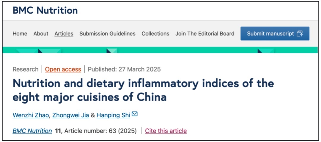 4.Zhao W, Jia Z, Shi H. Nutrition and dietary inflammatory indices of the eight major cuisines of China. BMC Nutr. 2025 Mar 27;11(1):63. doi: 10.1186/s40795-025-00999-2.