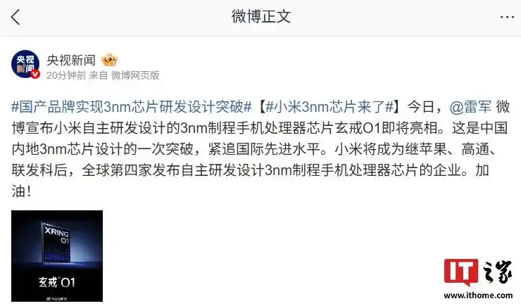 自研芯片玄戒O1浮出水面,小米成为继苹果、三星、华为后,全球第四家拥有自研手机SoC的手机品牌,正式加入"造芯俱乐部"。