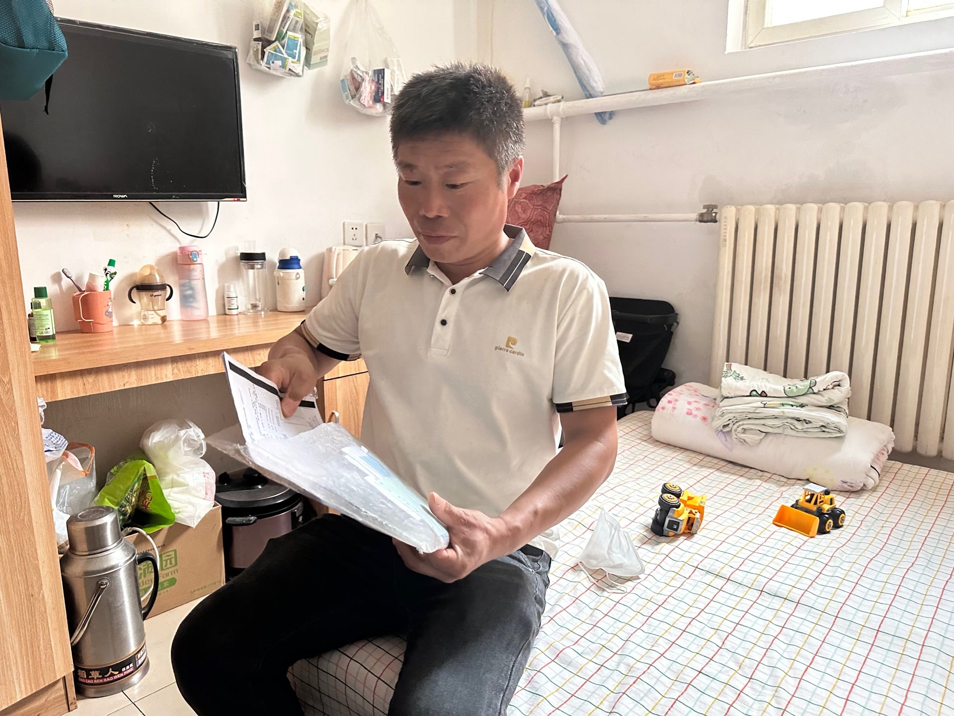 孟世祥在出租房里整理小儿子的医疗单据。
