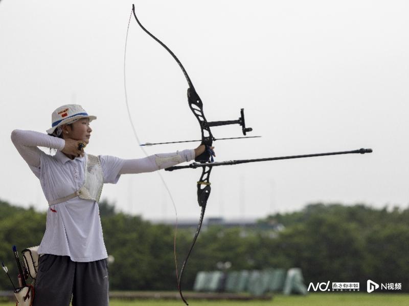 广东射箭队队员李奕何子在反曲弓的训练中。