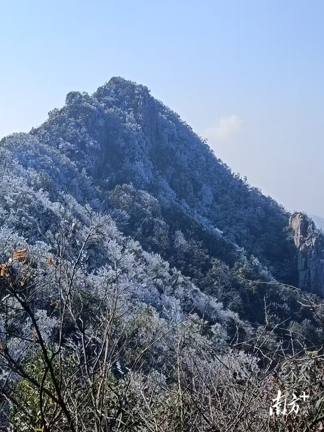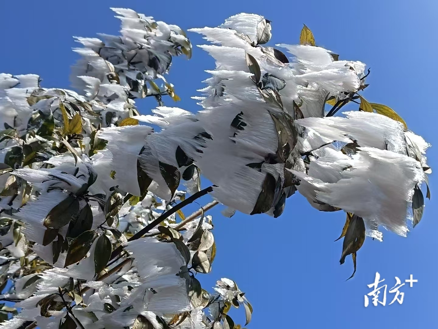 漫山遍野的树枝和茅草披上晶莹剔透的“冰衣”,仿佛为这片大地描绘了一幅粉妆玉砌的绝美画卷。这是广东2025年以来的首场冰挂景观,也为岭南大地送上了一场冬日的视觉盛宴。