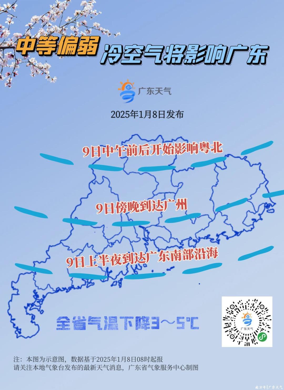 据广东省气候中心预测,1月出现全省性寒潮天气影响的可能性不大,但冷空气活动频繁。这不,新一股冷空气又来了(但依旧没有带来像样的降水)。新一股冷空气明天到冷空气进程新一股冷空气将于9日白天开始南下影响广东:9日中午前后开始影响粤北,傍晚到达广州,上半夜到达广东南部沿海,过程日平均气温下降3-5℃。