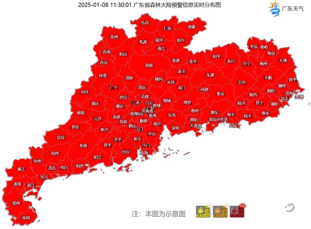天晴干燥,截至1月8日早晨,全省共有103个森林火险红色预警信号生效中