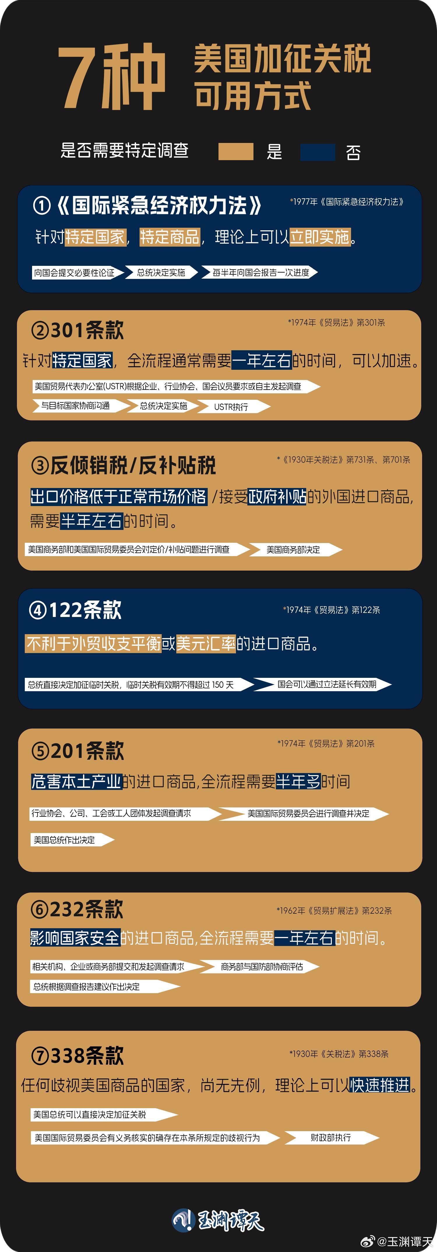 根据谭主梳理,美国对外国加征关税有7种方式,流程往往需要至少半年的时间。