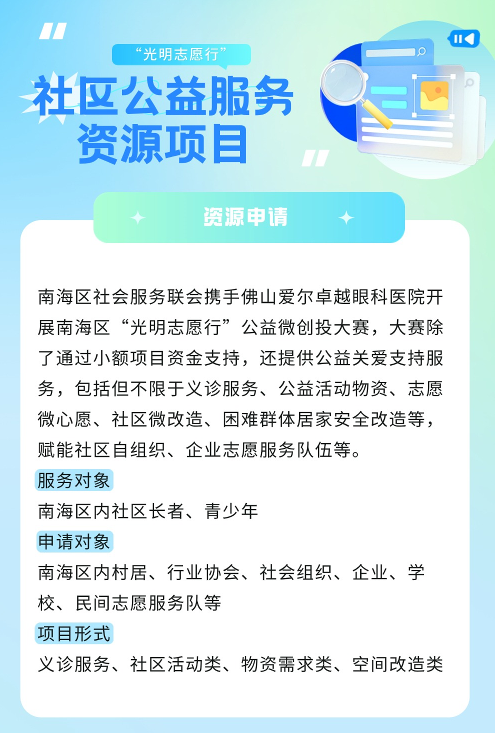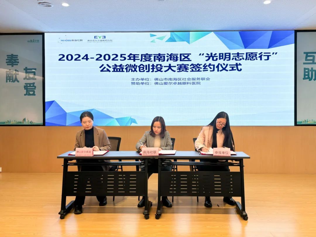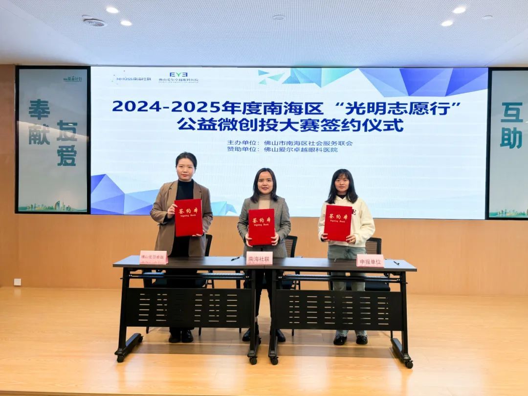 为贯彻落实党的二十大精神,充分撬动多元主体参与基层社会治理,推动社区慈善公益事业发展,2024年底,南海区社会服务联会携手佛山爱尔卓越眼科医院共同启动2024-2025年度南海区“光明志愿行”公益微创投项目大赛征集,通过小额项目资金支持,回应“一老一小”和新业态新就业群体需求,关爱南海居民视力健康,打造社区公益服务品牌。2月17日,大赛签约仪式顺利举行,12个入围项目将正式起航。