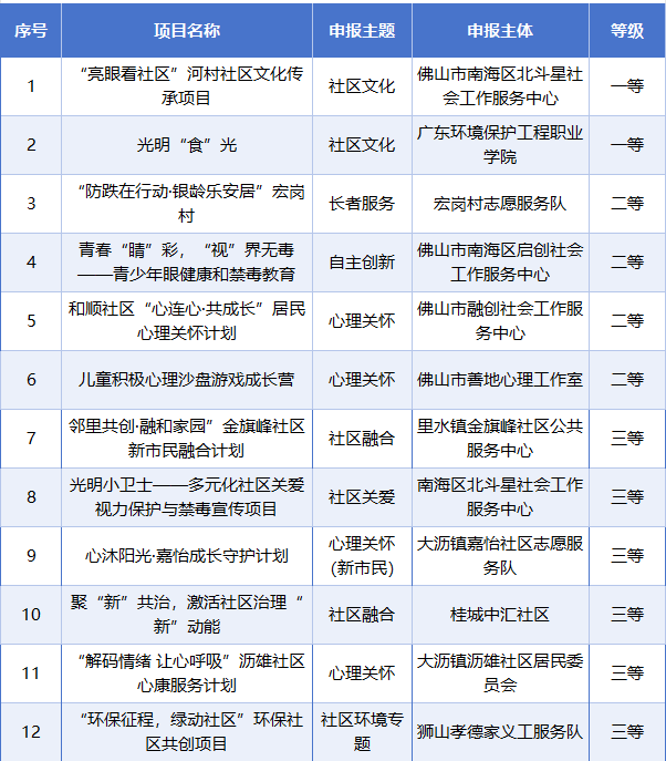 本次大赛自启动以来,共收到来自村居、社会组织、企业、学校、民间志愿服务队等单位的17份项目申报书,涵盖心理关怀、社区文化、社区融合、社区环境、社区关爱等项目类型,经过项目征集、评审、公示等阶段,最终评选出12个优秀项目给予资金支持和资源对接,助力项目落地实施。