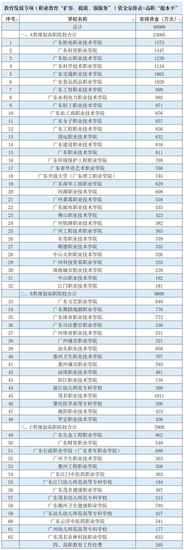 高职院校根据广东高职“创新强校工程”考核分为A、B、C三类,32所A类规划高职院校共获得23005万元;16所B类高职院校共获得9600万元,14所C类高职院校共获得7000万元。