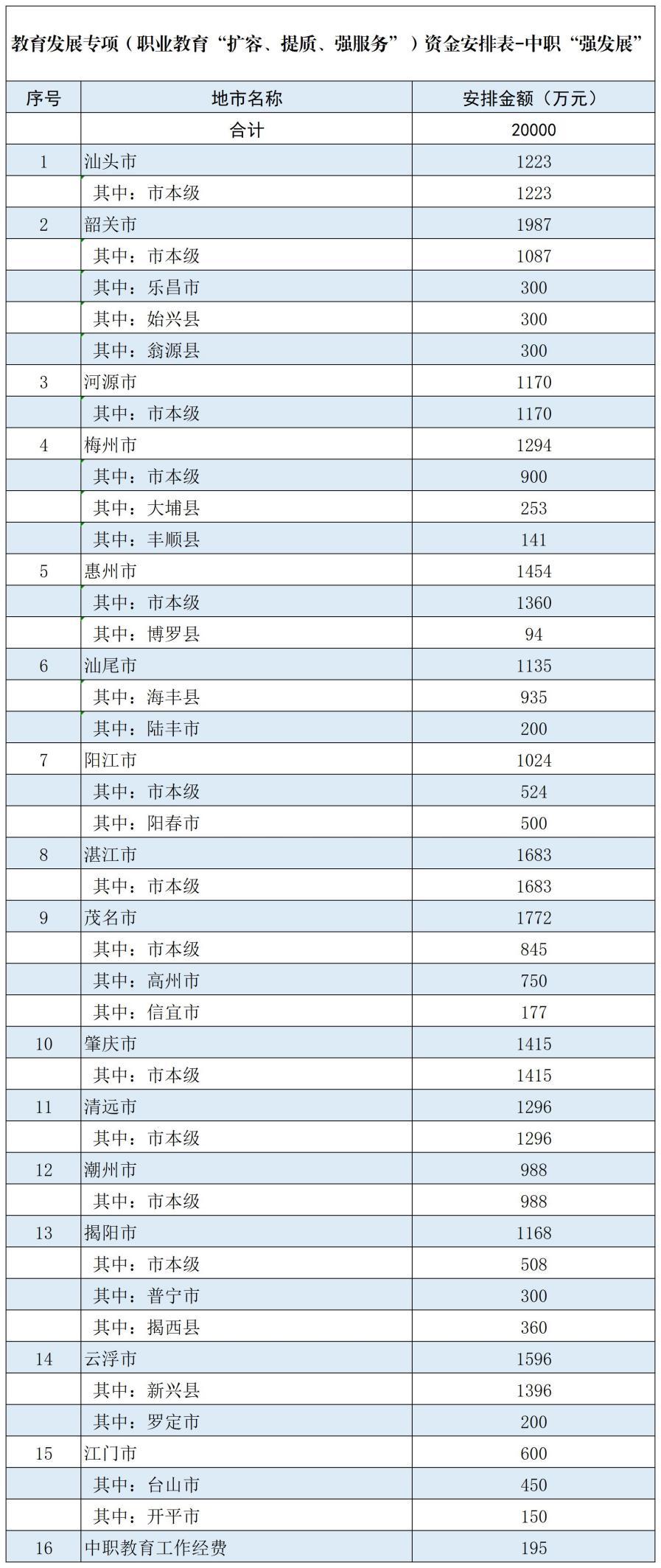 其中,韶关、茂名、湛江、云浮4市的中职教育发展专项资金均超过1500万元,韶关以1987万元占得鳌头。