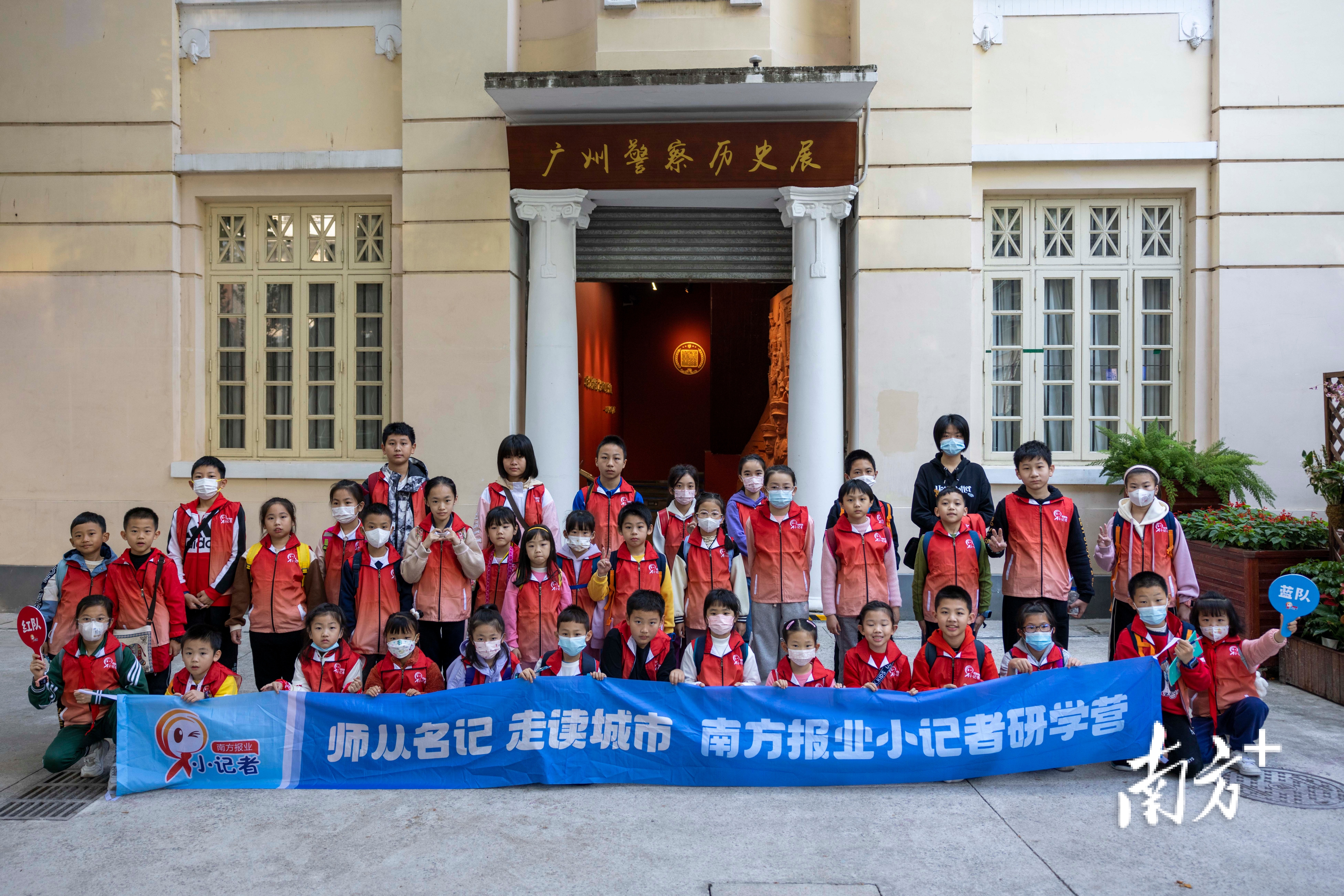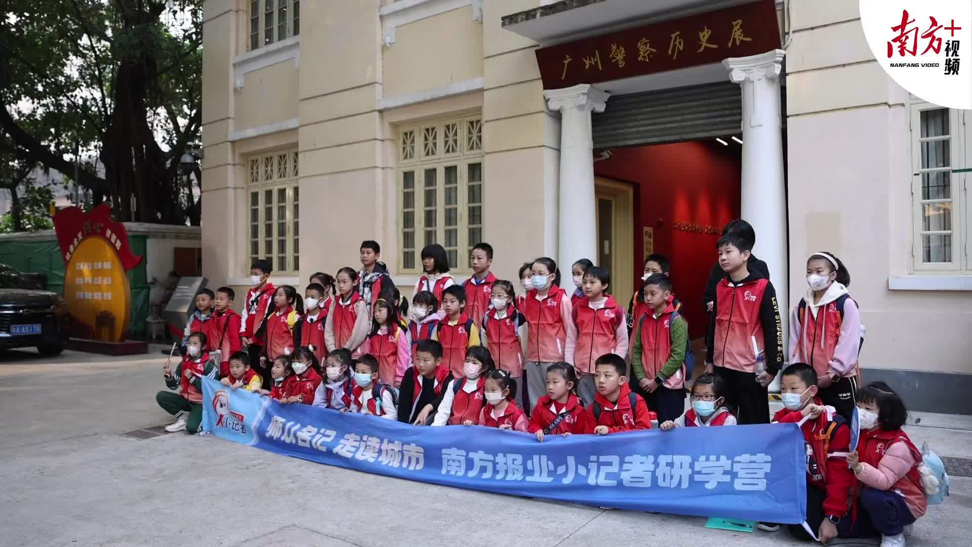 “小记者们,这面红蓝相间,左上角有警徽的旗帜,是我们的中国人民警察警旗。”在广州市公安局指挥中心办公室三级高级警长曹红斌的带领下,小记者们开始研学。