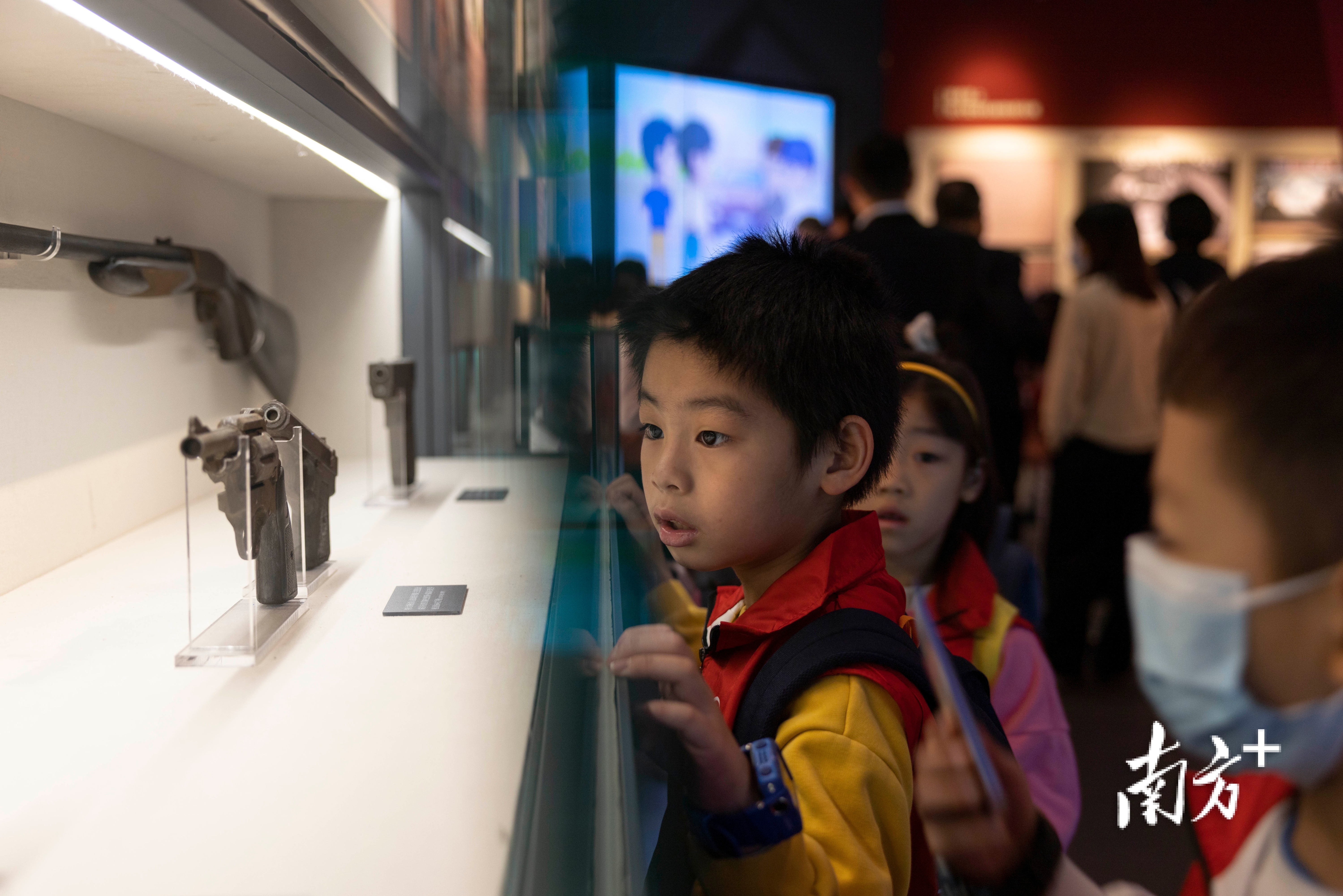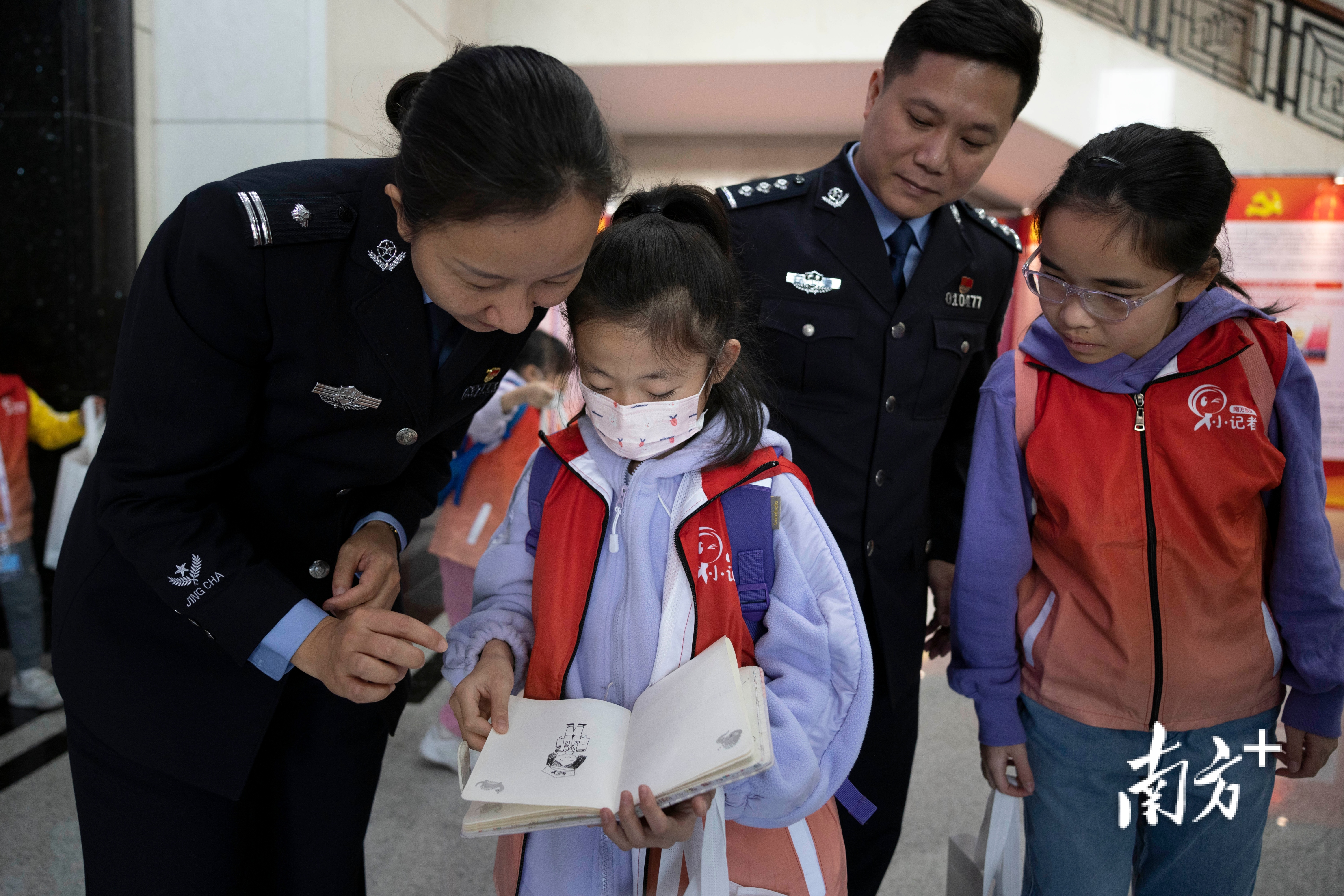 “这是广州沙面租界警察使用过的‘警哨’,它比我们常见的口哨长一些,外观不一样;这个纪念品是汶川县公安局送给我们的,2008年汶川大地震,我们广州公安特警是首支抵达现场参与救援的公安特警队伍;这是一副印着通缉犯照片和信息的扑克牌,群众看到后可以给警察叔叔提供线索……”曹红斌耐心地向小记者们讲述着这一个个老物件背后地故事。小记者们也在自己的笔记本上认真记录。