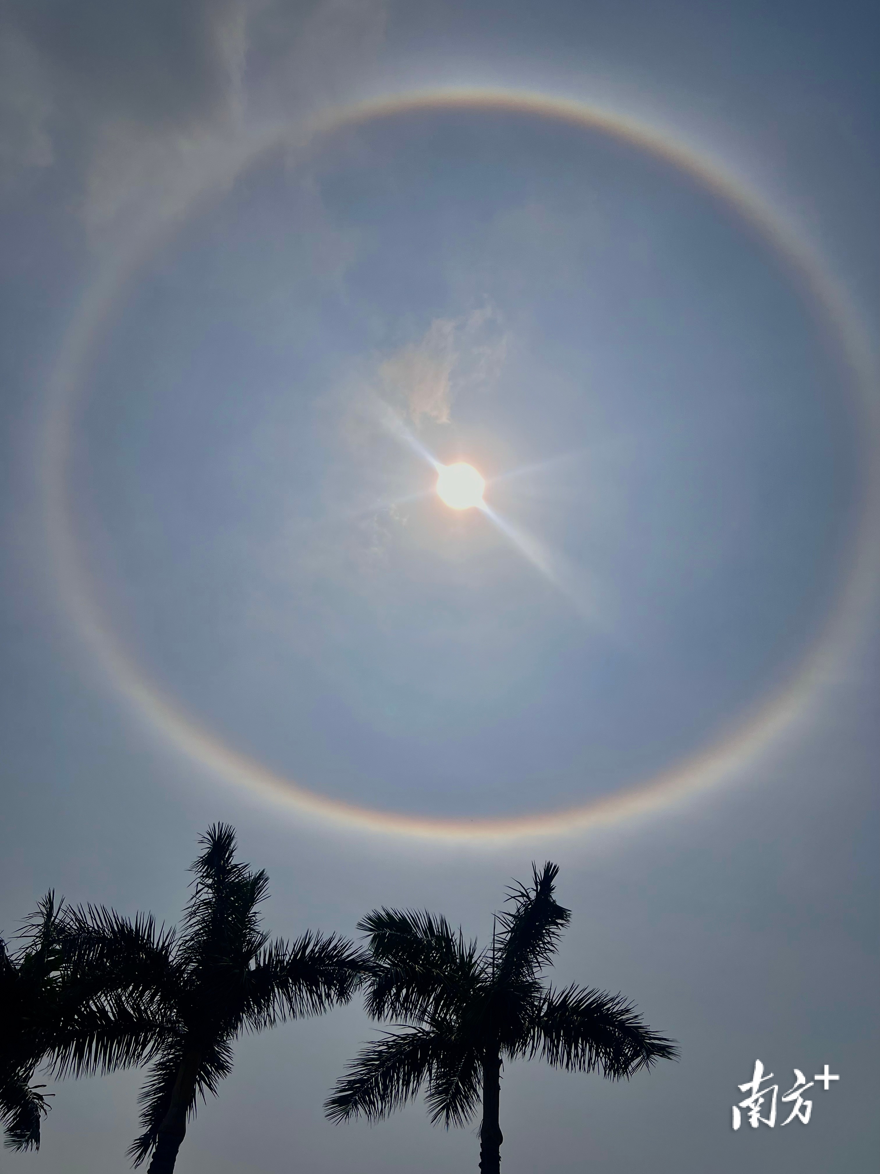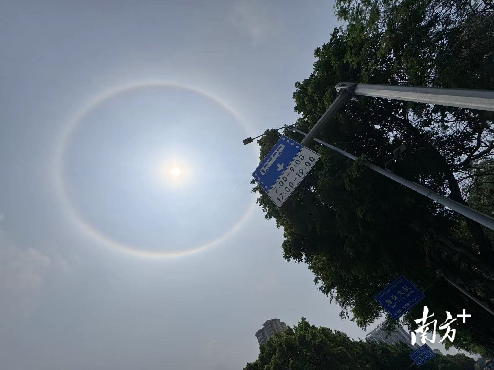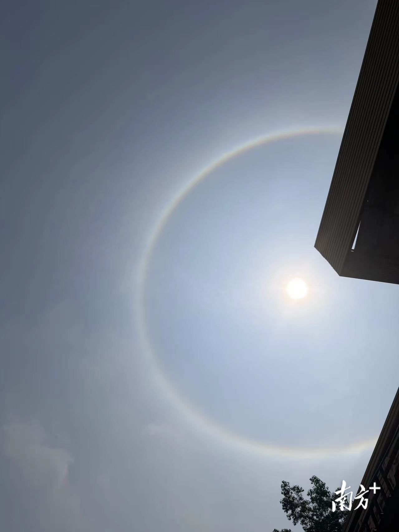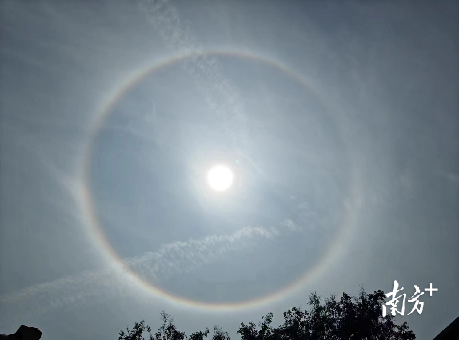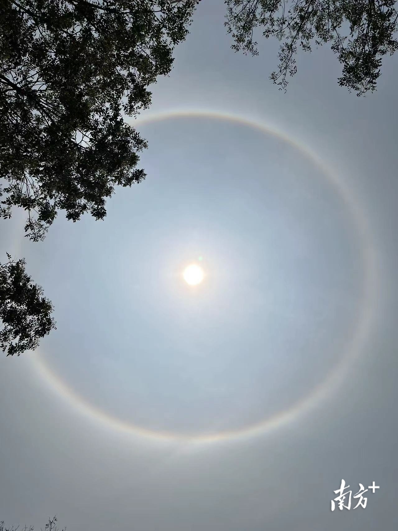4月13日,市民在广州、深圳、佛山等地观察到日晕现象,太阳旁边有一圈肉眼可见的光环。