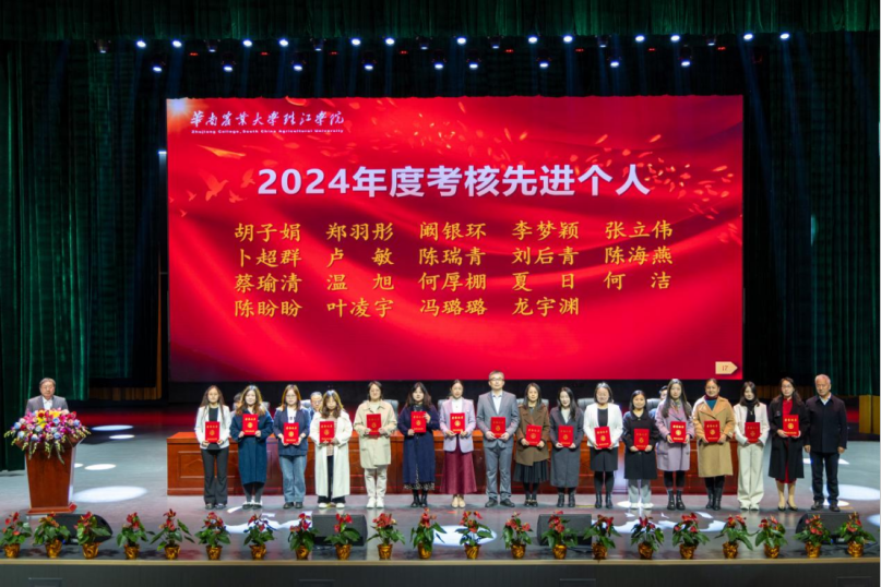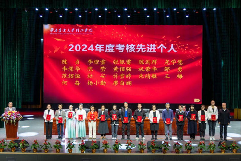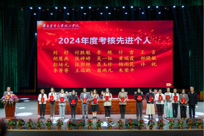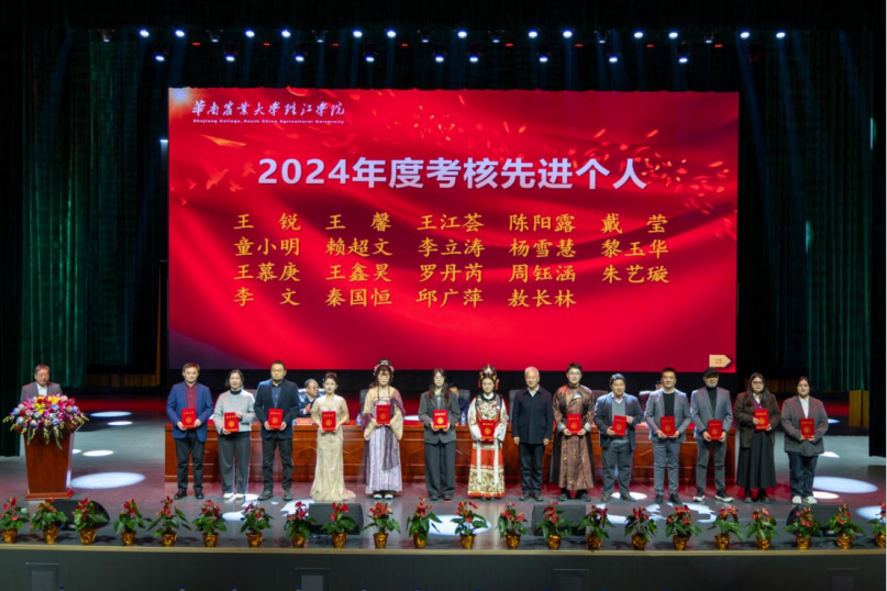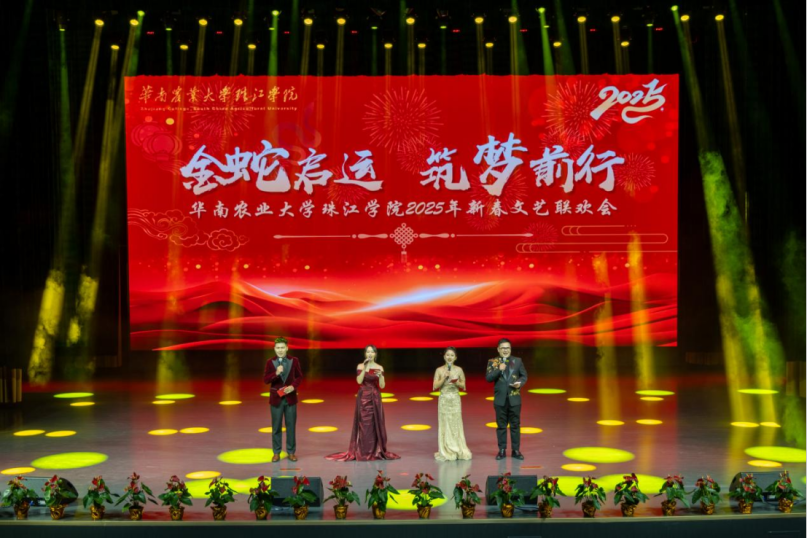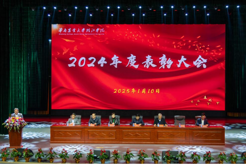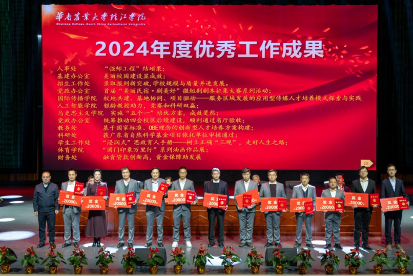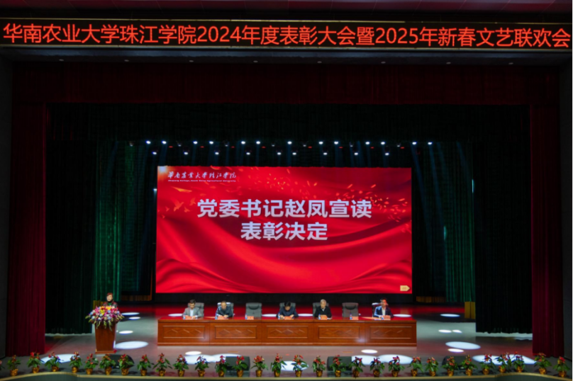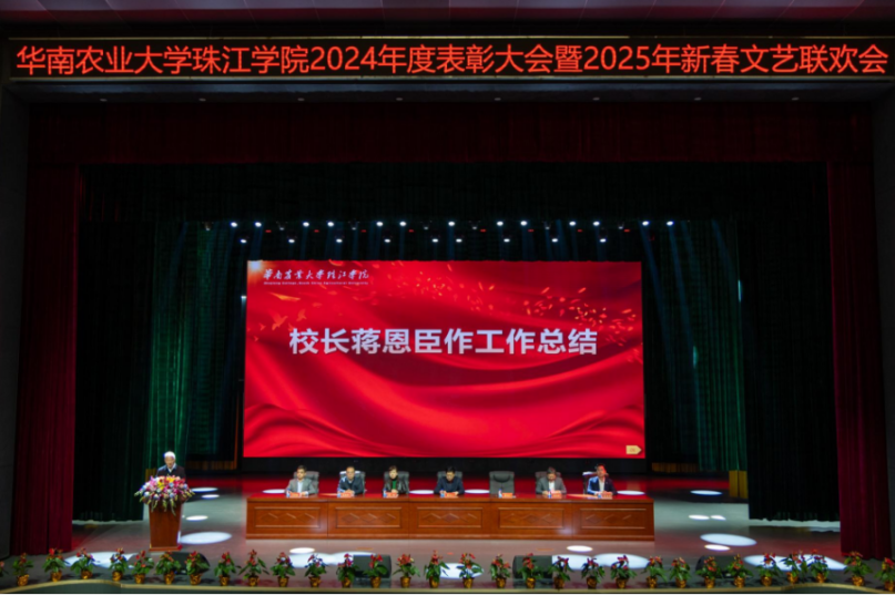 华珠新篇,同耀星辉。过去的一年,全体师生紧紧围绕“十个一流”建设发展目标,扎实推进“三年行动计划”,高质量发展取得累累硕果。为表彰先进典型,增强集体凝聚力,1月10日下午,华南农业大学珠江学院2024年度表彰大会暨2025年新春文艺联欢会在珠江剧院举行。华珠董事长陈香山,校长蒋恩臣,党委书记赵凤,副校长袁炎清,党委副书记、副校长赵春辉,原校长助理汪文平,校长助理马雷猛出席表彰大会,同全体教职工一起观看演出,喜迎新年的到来。