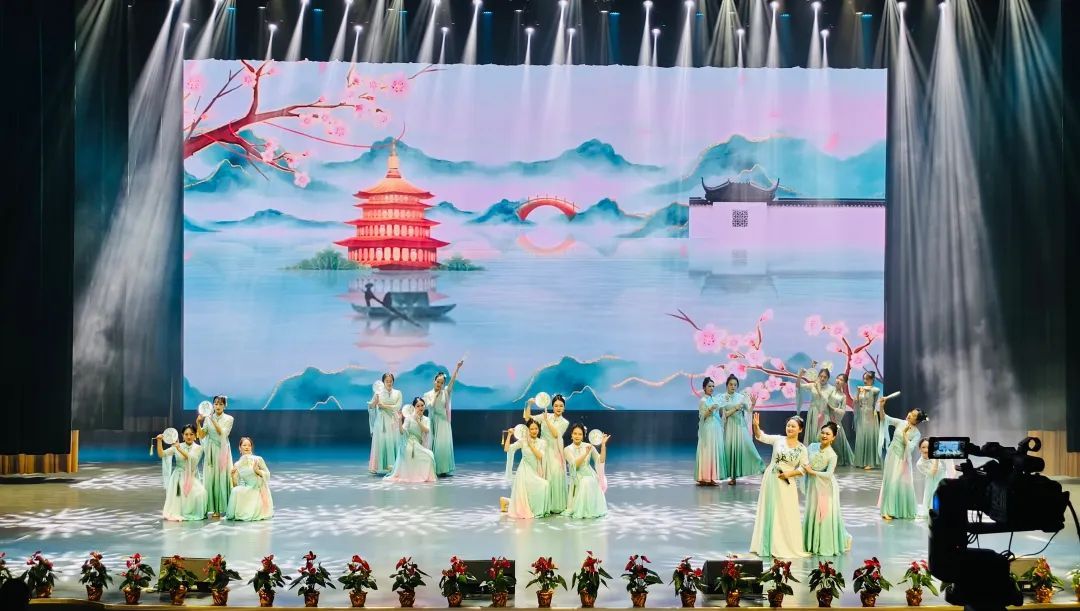 由各辅导员带来的《烟雨唱扬州》节目,以江南水乡为背景,舞者们身着古典服饰,在轻纱薄雾中翩翩起舞,歌声柔美,动作细腻,把扬州的烟雨朦胧与诗情画意展现得淋漓尽致。