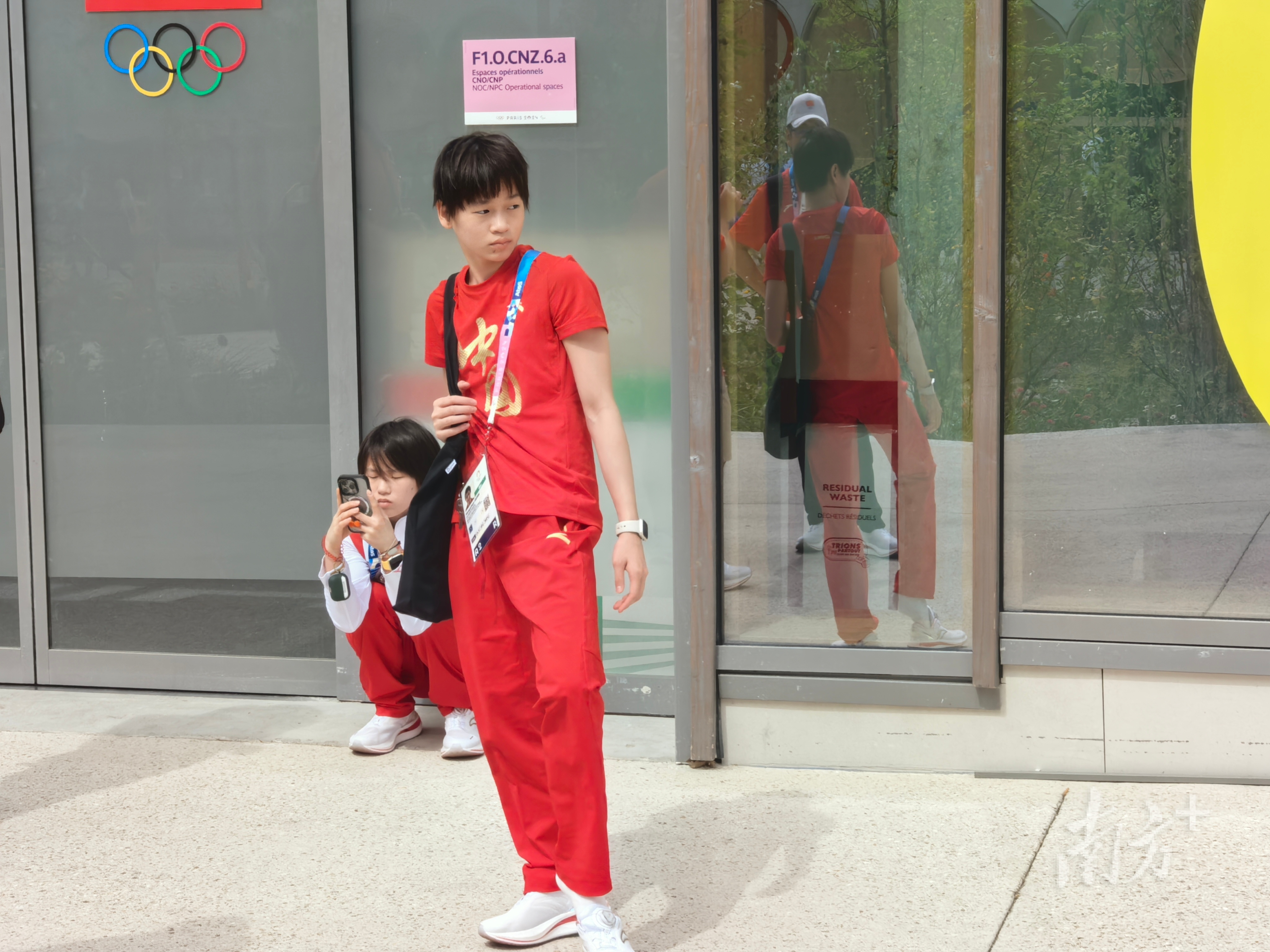 一身红衣去训练,南方+记者巴黎奥运村偶遇全红婵